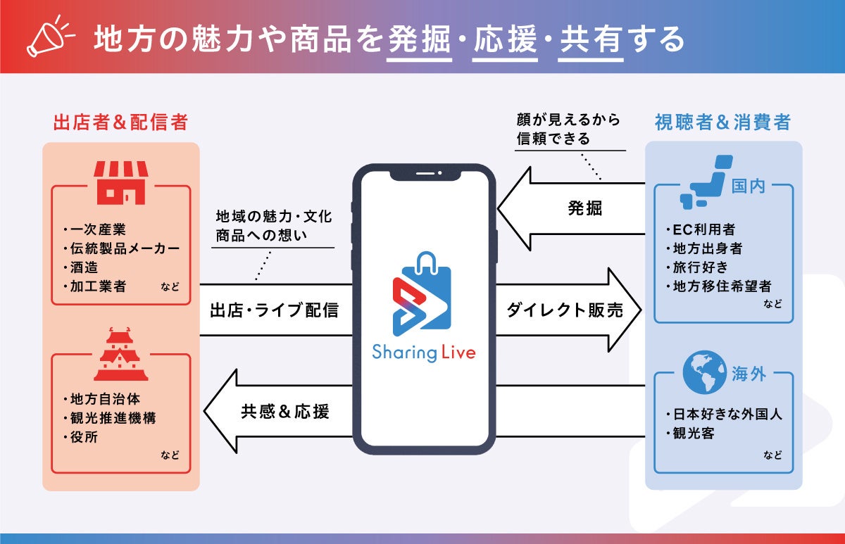 Sharing Liveのコアバリューは、「みつけよう!第2の故郷(ふるさと)」。ライブコマースを通じて、消費者と出店者をオンタイムでつなぎ、商品を紹介。出店者は商品の価格を自身で決め、それをアプリ内で販売します。配信中はチャットやコメントを通じて双方向のコミュニケーションが可能です。