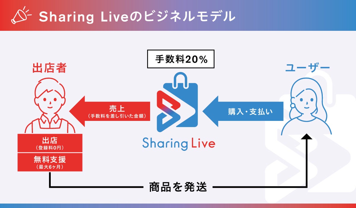 Sharing Liveは出店者から登録・出店費用は一切いただかず、販売手数料を受け取る成果報酬型のビジネスモデルです。クリップス社の利益は、販売手数料20%から決済手数料5%、一部の提携企業に発生するマージンやプロライバーへの支払い(約5%)を差引いた額(平均で販売手数料の10%程度)になります。