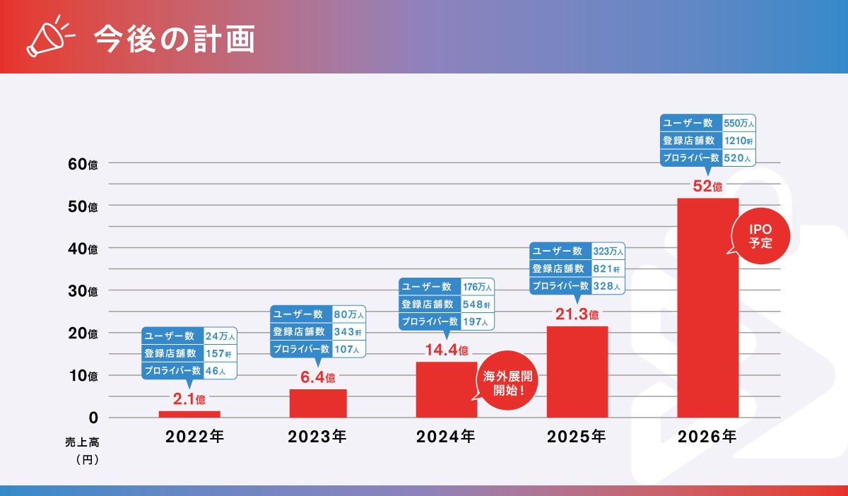今後の成長計画としては、直接各店舗に営業を行うのではなく、提携企業を通じた登録店舗の獲得を図ります。既に、その開拓パートナーである地方自治体や、地方支援企業(大手印刷会社、広告会社等)と提携。各自治体、商業施設、一次産業(農業、水産業)などとの販売支援プロジェクトを精力的に展開し、2026年までに約1200店舗の登録を目指します。また、ユーザー数の拡大に向けては、YouTuberなどのインフルエンサーをゲストに呼び、プロライバーとペアでコンテンツを配信。SNSを通じたファンの獲得を狙います。