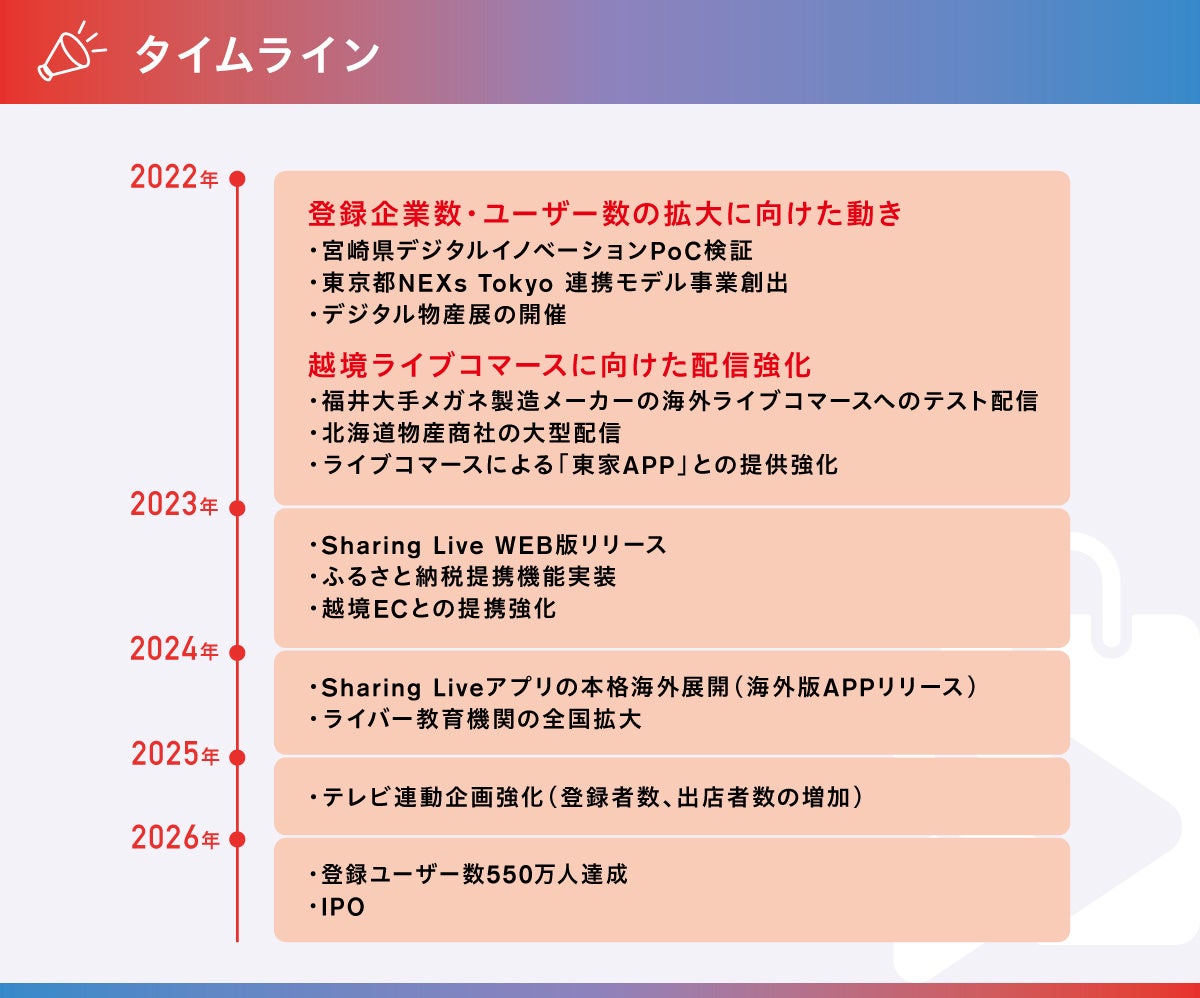中期的には、海外版アプリのリリース、中国を中心とした販路の拡大や、地方のリアルイベントとの交互集客、地域ローカルテレビとの連動などで、さらなるユーザー獲得を推し進めます。そして、出店数1200店舗、国内外でのユーザー数が550万人に達成予定の2026年にIPOを計画しています。より多くの生産者と消費者をつなげ、価格以外の「付加価値」に目を向ける世の中を実現。そして、地方創生のライブコマースNO.1プラットフォームを目指します。