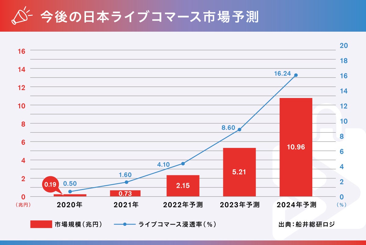 2021年のライブコマースの市場規模は7300億円、顧客への浸透率は1.6%と算出されています。現時点ではライブコマースの認知度はそこまで大きくないものの、コロナ禍のステイホームによるお取り寄せ需要、EC利用者数増加の背景から今後も拡大。中国から3年ほど遅れてライブコマースが浸透すると予測され、2024年には10兆円の市場規模になると推測されます。