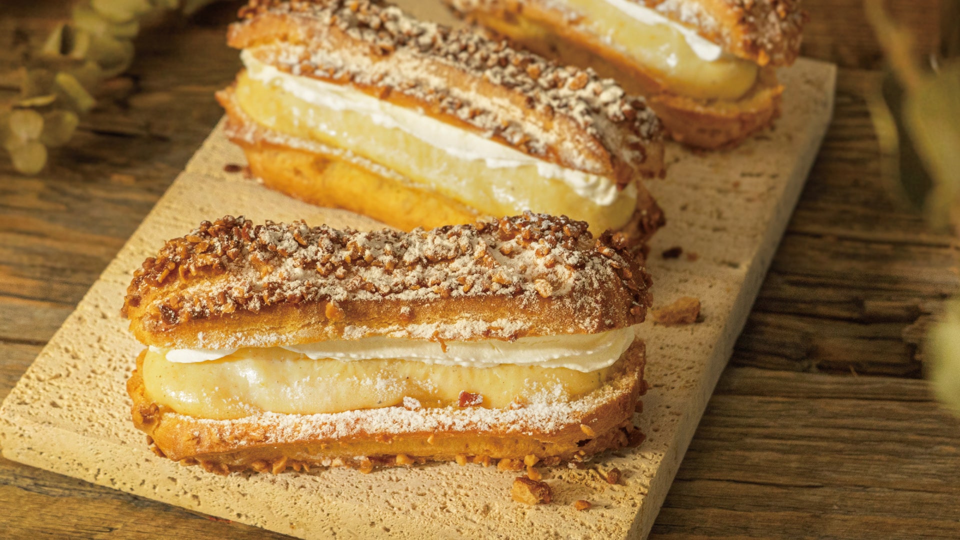 ふわふわビスケット生地でマスカルポーネ入りカスタードクリームをサンドしベルギー産チョコレートの上にミルク感あふれる砂糖不使用の北海道産生クリームをしぼった口どけとろける新食感エクレア。