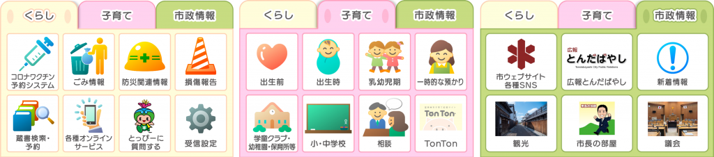 今回のリニューアルでリッチメニューのタブ機能を導入し、デザインも一新しました。くらしや市政情報のタブに加えて、子育て関連のメニューを追加。出産前から教育、相談までさまざまな子育て関連コンテンツをLINEから調べることが可能となりました。