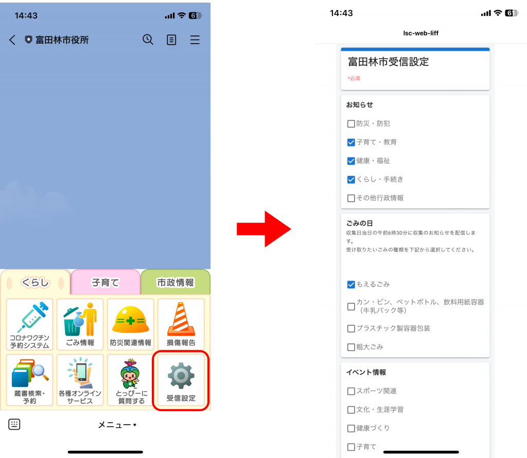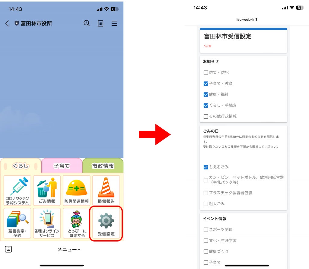 これまではLINEに登録している全ての住民に送られていた配信ですが、リニューアル後からは欲しい配信カテゴリーを選択することができます。※当面の間は受信設定された方についてもすべての情報を配信します。12/11時点