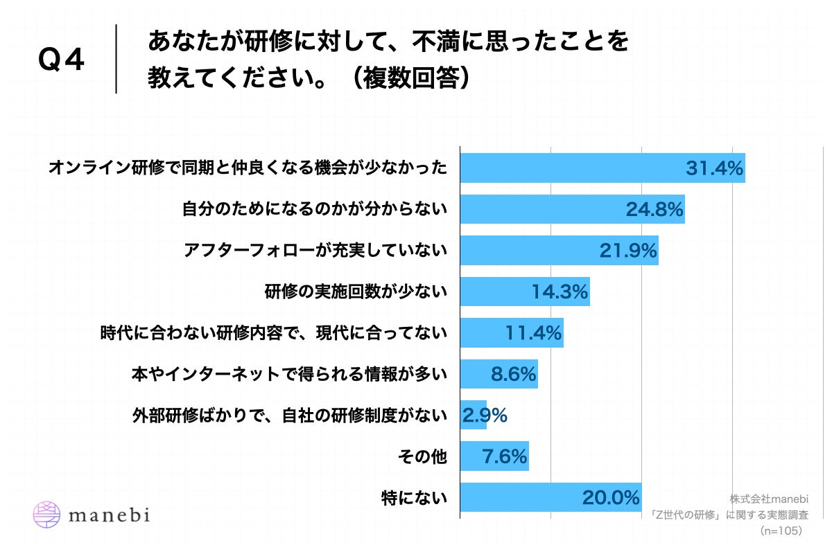 - 研修に対する不満、「オンライン研修で同期と仲良くなる機会が少なかった」が31.4%、「自分のためになるのかが分からない」が24.8%