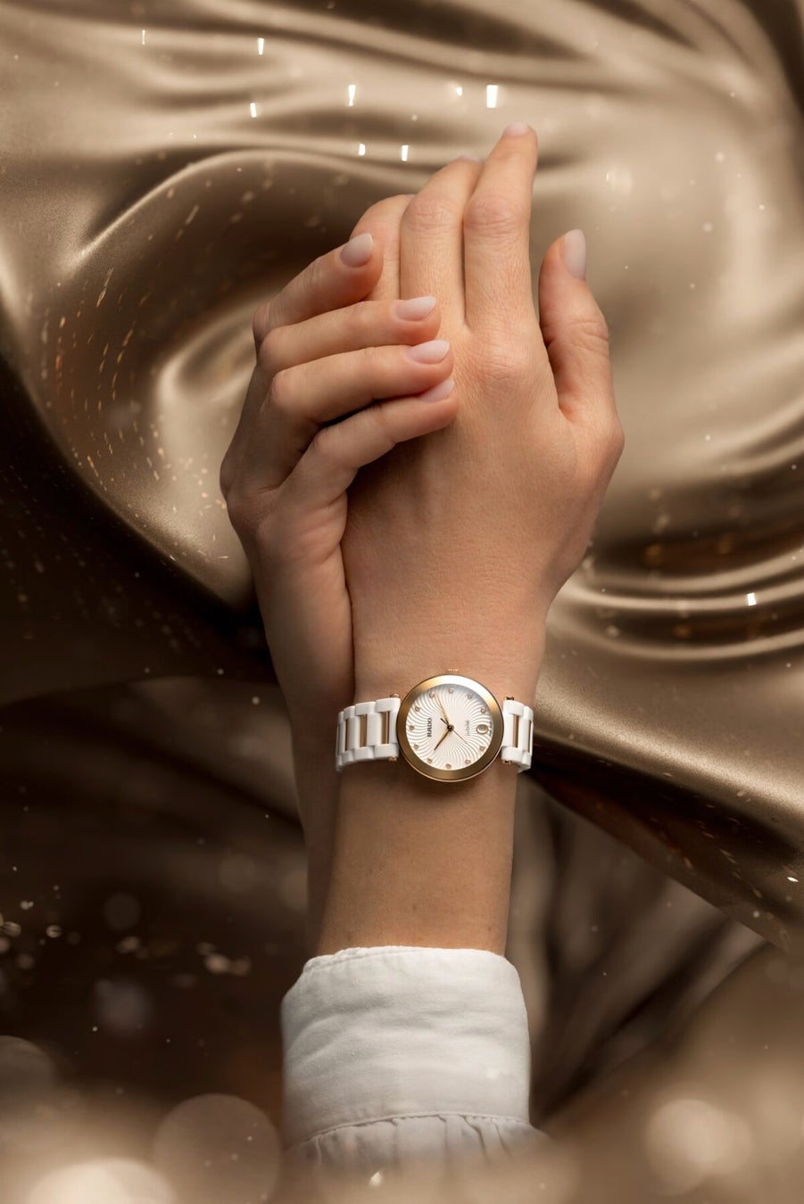 鮮やかなブラウンにローズゴールドのメタライゼーションを施したポリッシュ仕上げのブラウンハイテクセラミックタイプは温かみのあるエレガントな表情を見せ、輝くようなホワイトにローズゴールドのメタライゼーションが施されたポリッシュ仕上げのホワイトハイテクセラミックモデルは、洗練された華やかさが際立ちます。