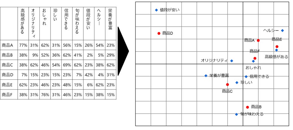 パリ第6大学のジャン=ポール・ベンゼクリによって開発されたコレスポンデンス分析は、統計学上のデータ解析手法のひとつで、集計表の形から複数の要素の類似度や関係の深さを調べることに長けた分析手法であり、近くにプロットされているマーカーほど類似性・関連性が高いことを示します。