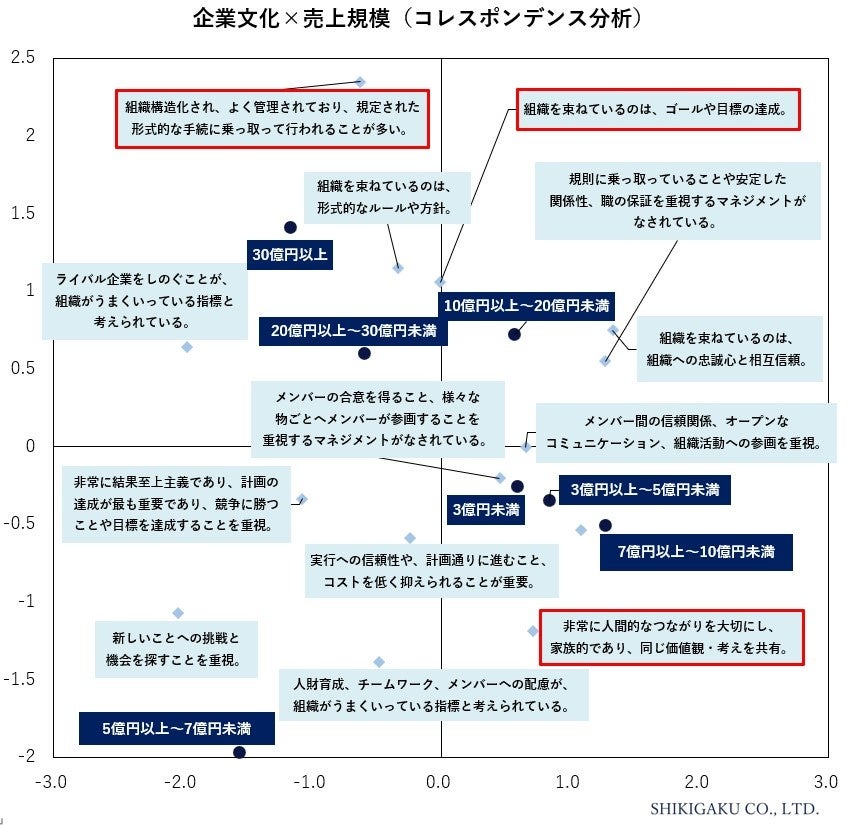 企業文化について売上規模別の特徴を把握するためにコレスポンデンス分析を行ったところ、売上規模10億円を境に上下方向に大きく分かれることになりました。上方向では「組織を束ねているのは、ゴールや目標の達成である」、「組織構造化され、よく管理されており、規定された形式的な手続に乗っ取って行われることが多い。」といった「官僚文化」や「マーケット文化」の特徴がみられる一方で下方向では「非常に人間的なつながりを大切にし、家族的であり、同じ価値観・考えを共有している。」といった「家族文化」の特徴が強くみられました。