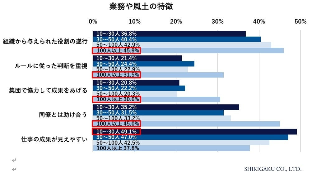 従業員数が100人以上の企業では、計画にそって、ルールに従った判断を重視し、集団で協力して成果を上げるという特徴がある。一方で、10人以上30人未満の企業では、上下関係を気にせず、個人の役割が明確で、主体的な判断を重視する特徴がある。