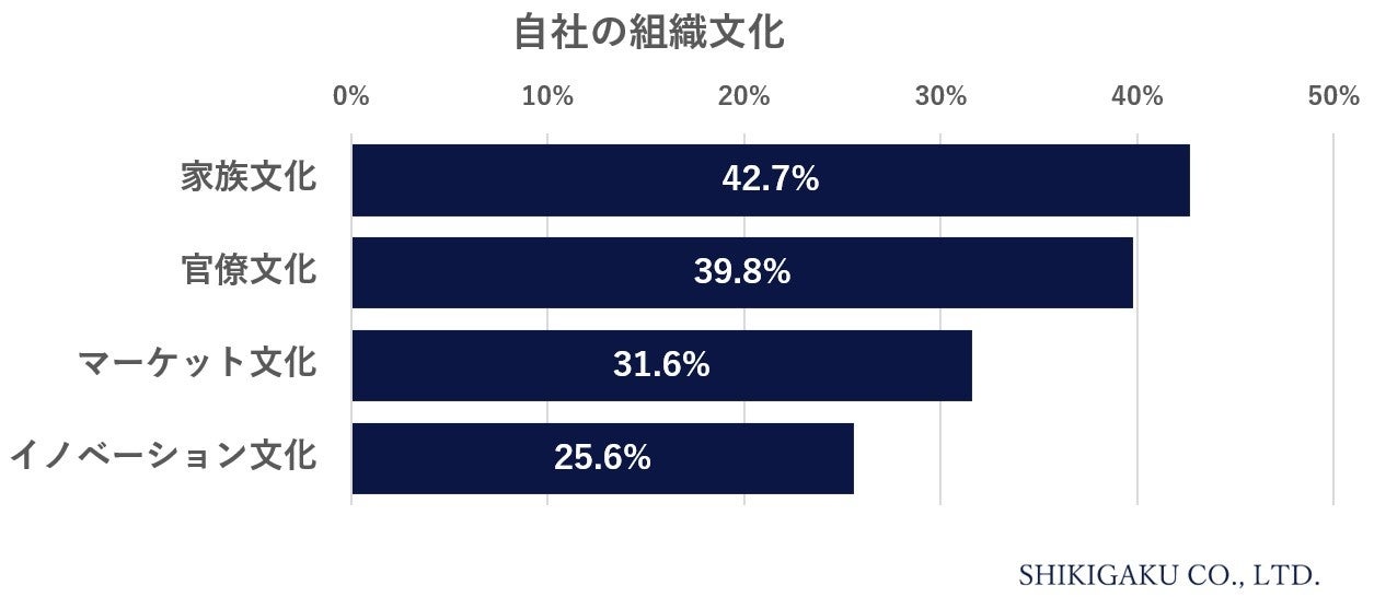 自社の組織文化『家族文化』42.7%『イノベーション文化』25.6%。集団で協力して成果をあげる意識に差