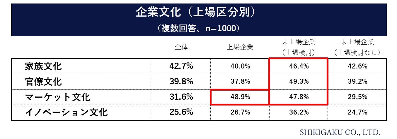 上場企業または上場を検討している企業では、未上場企業(上場検討なし)に比べてマーケット文化が強い傾向にある。