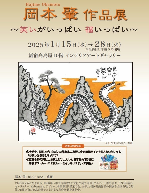 【新宿高島屋】作品そのものがパワースポット。『岡本肇 作品展~笑いがいっぱい 福いっぱい~』縁起物尽くし×25年の干支 巳 の作品も多数展示販売。2025年1月15日(水)~1月28日(火)まで。