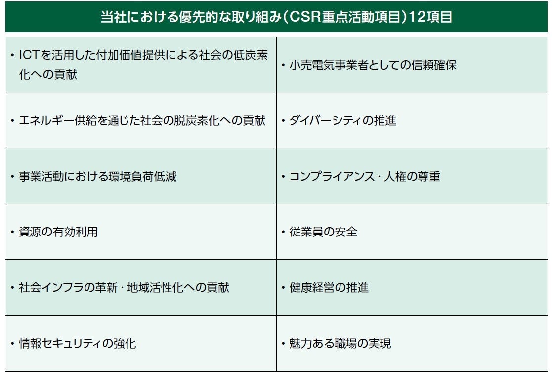 エネットは、エネルギー&ICTの新たな価値で変化するエネルギーの市場環境に適応するとともに、小売電気事業者としての社会的責任やステークホルダーからの期待・要請に応え続けるために、CSR活動の優先的な取り組み(CSR重点活動項目)を定め、ESG経営を推進しています。なお、本レポートはCSRレポートの国際基準「GRIサステナビリティ・レポーティング・スタンダード※1」を参考に編集しています。