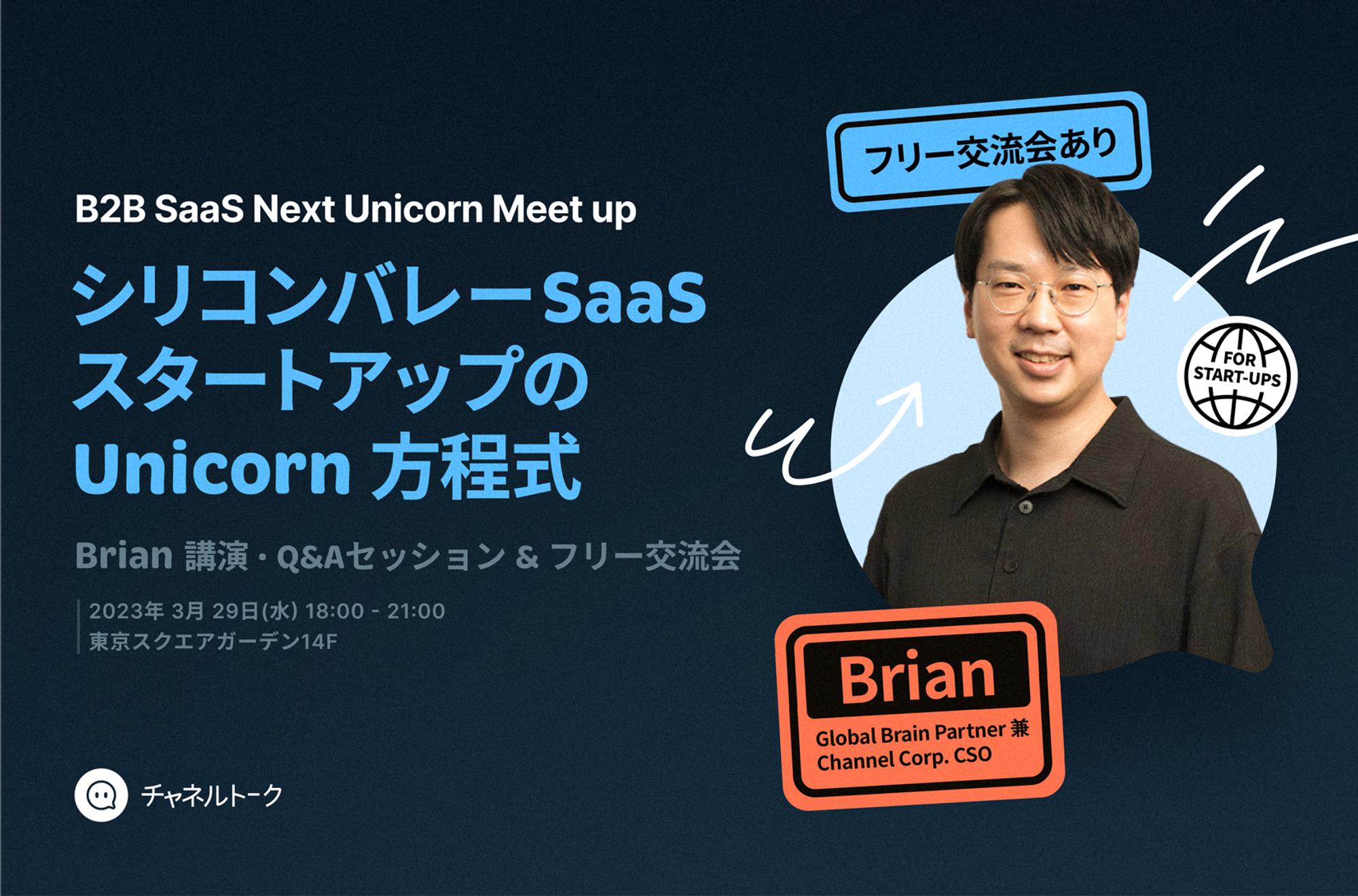 ・19時開始〜 Global Brain Partner 兼 Channel Corporation CSO Brian講演「シリコンバレーSaaSスタートアップのUnicorn方程式」