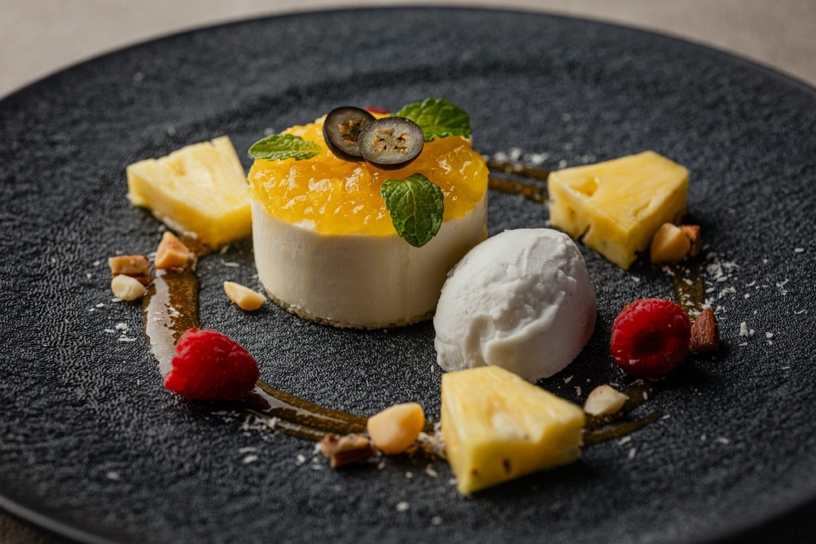 パイナップルムースに爽やかなココナッツアイスをトッピングし、香り高い紅茶シナモンソースで絶妙なバランスを楽しむ至福の一品です。