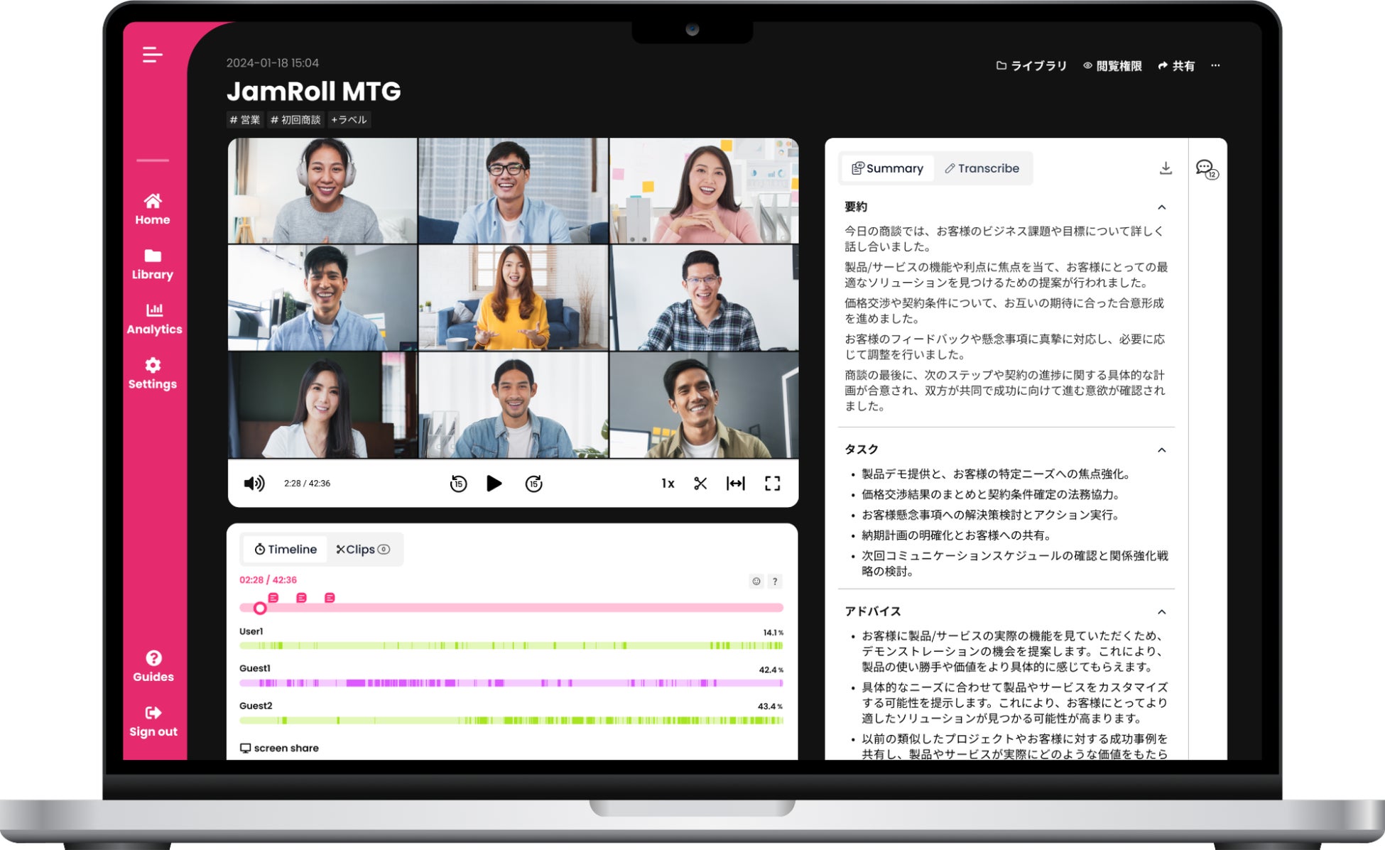 JamRollは、会話を見える化し営業生産性を向上させる商談支援AISaaSです。電話・オンライン商談の全ての会話を自動録音・録画、文字おこし、音声・感情AI解析で営業スキルの向上と情報共有を自動化し、組織の事業成⻑に貢献します。