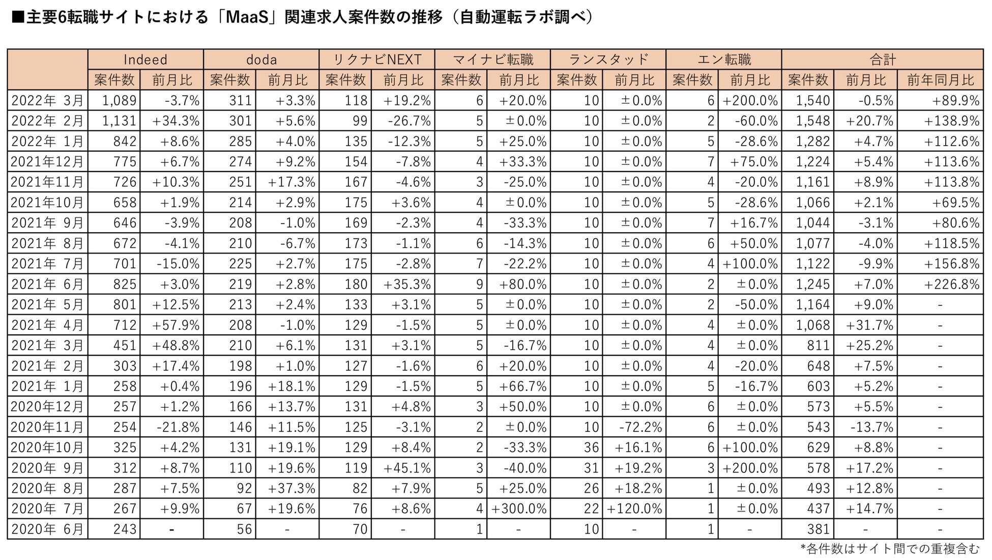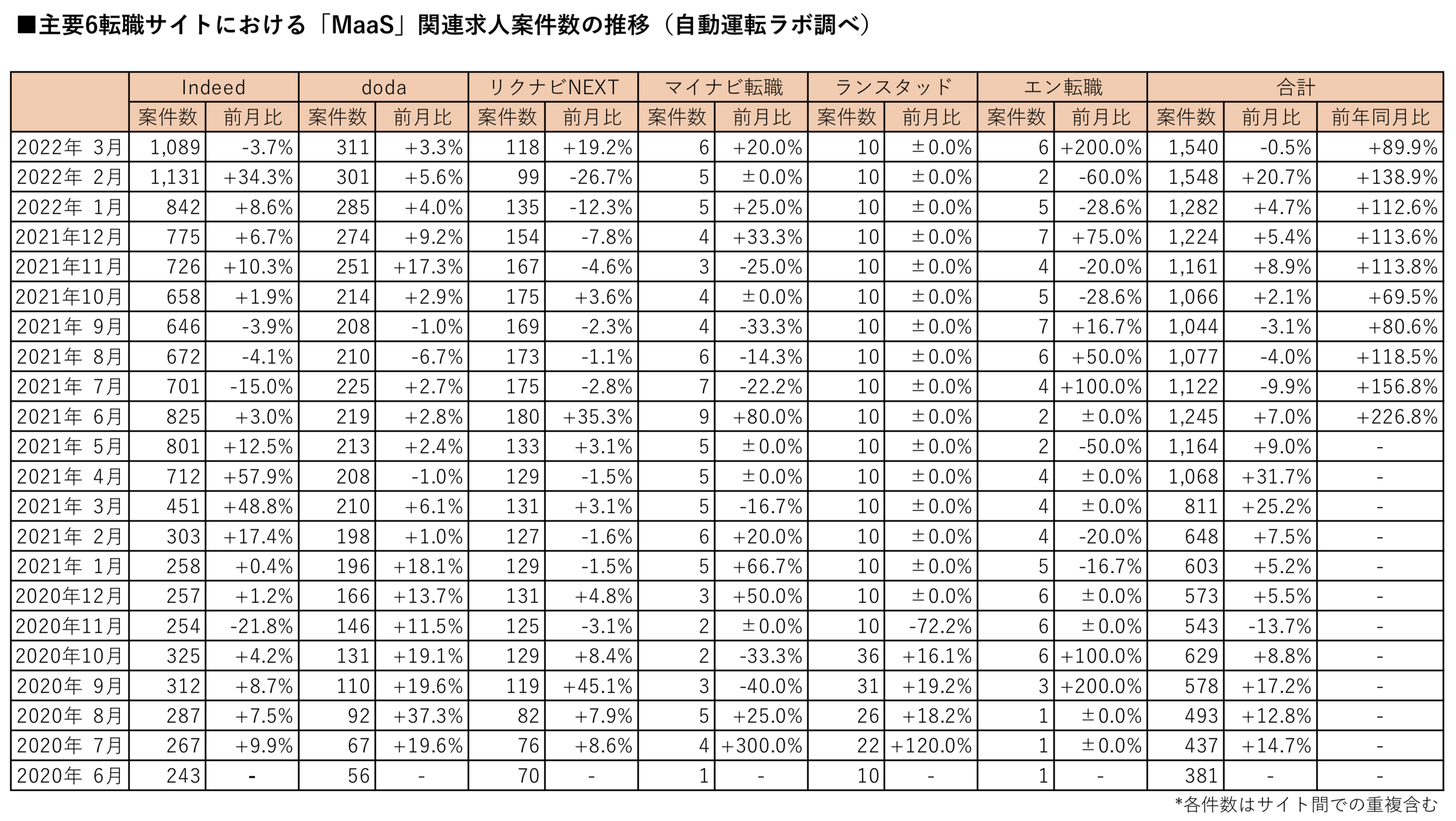 「MaaS」の関連求人案件数(主要転職6サイト)は2022年3月末時点で、前月比0.5%減、前年同月比89.9%増の1,540件となりました。前年同月比での増加は10カ月連続となっています。