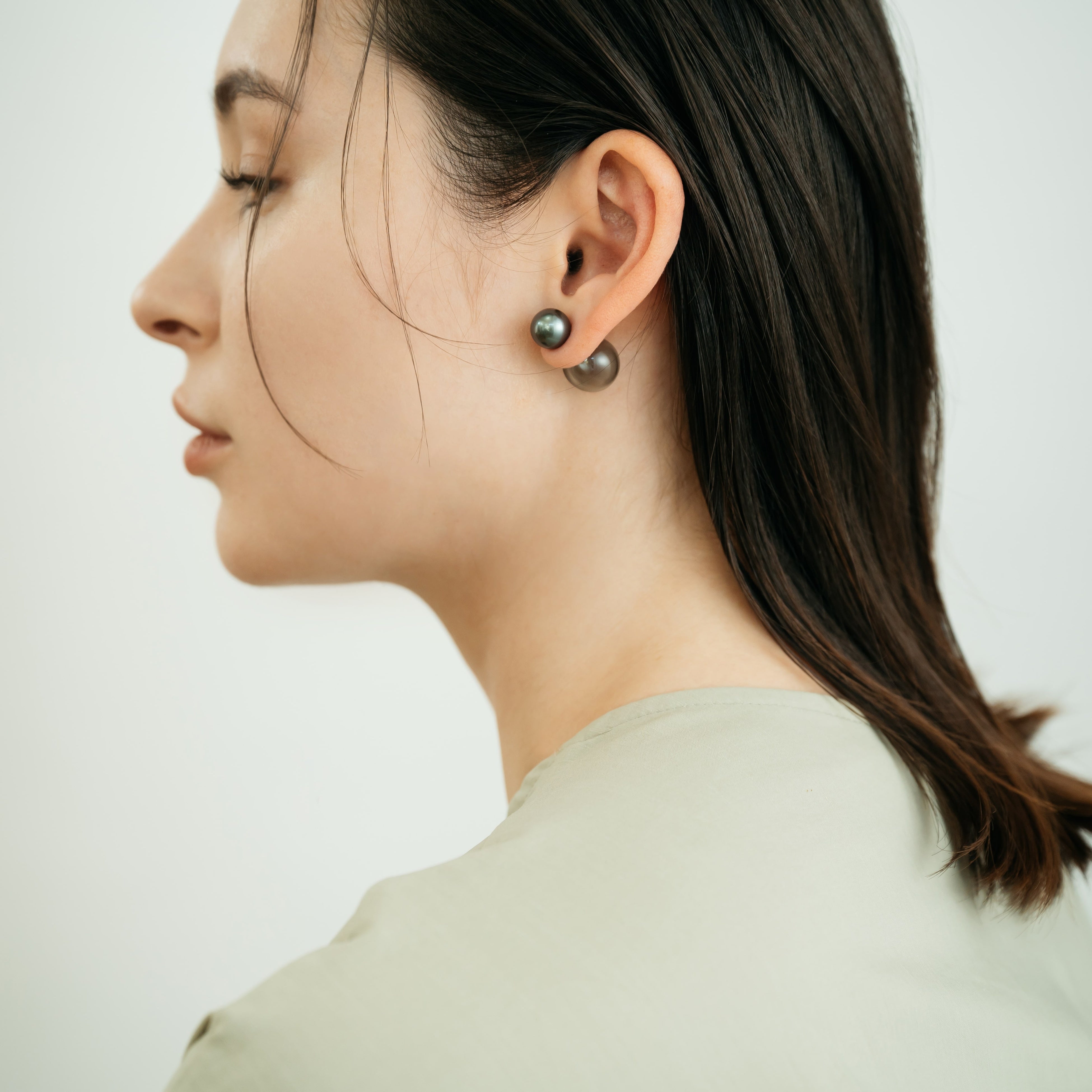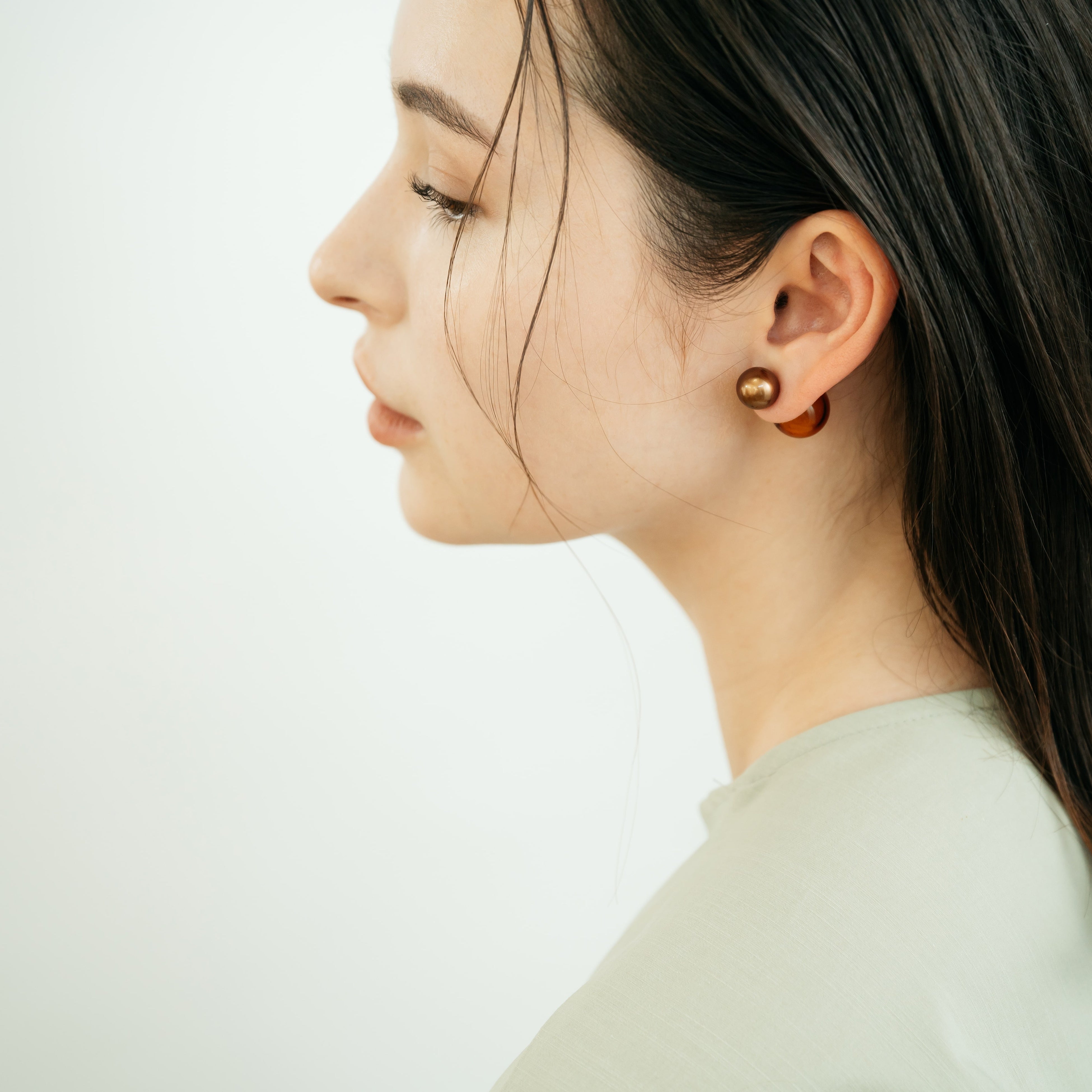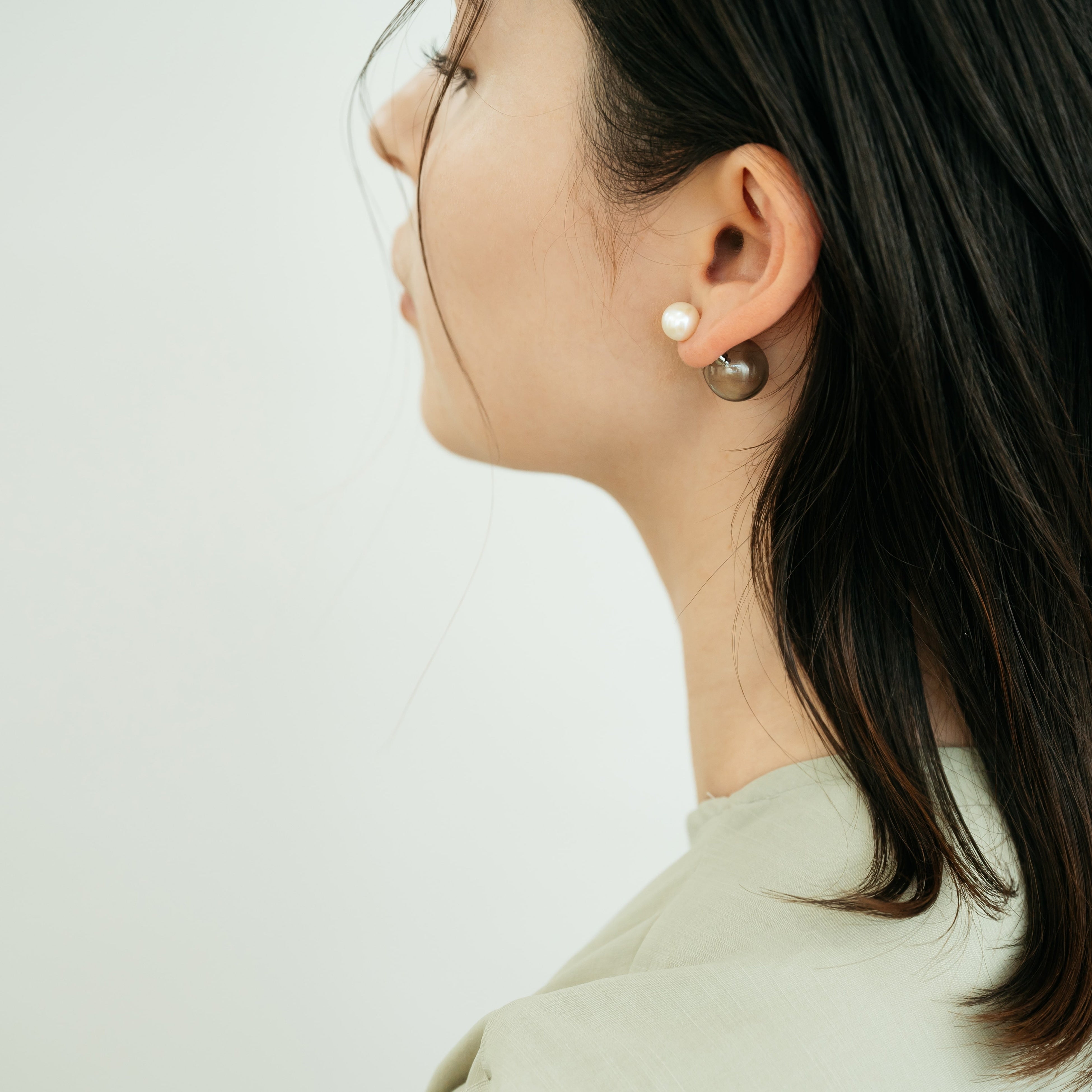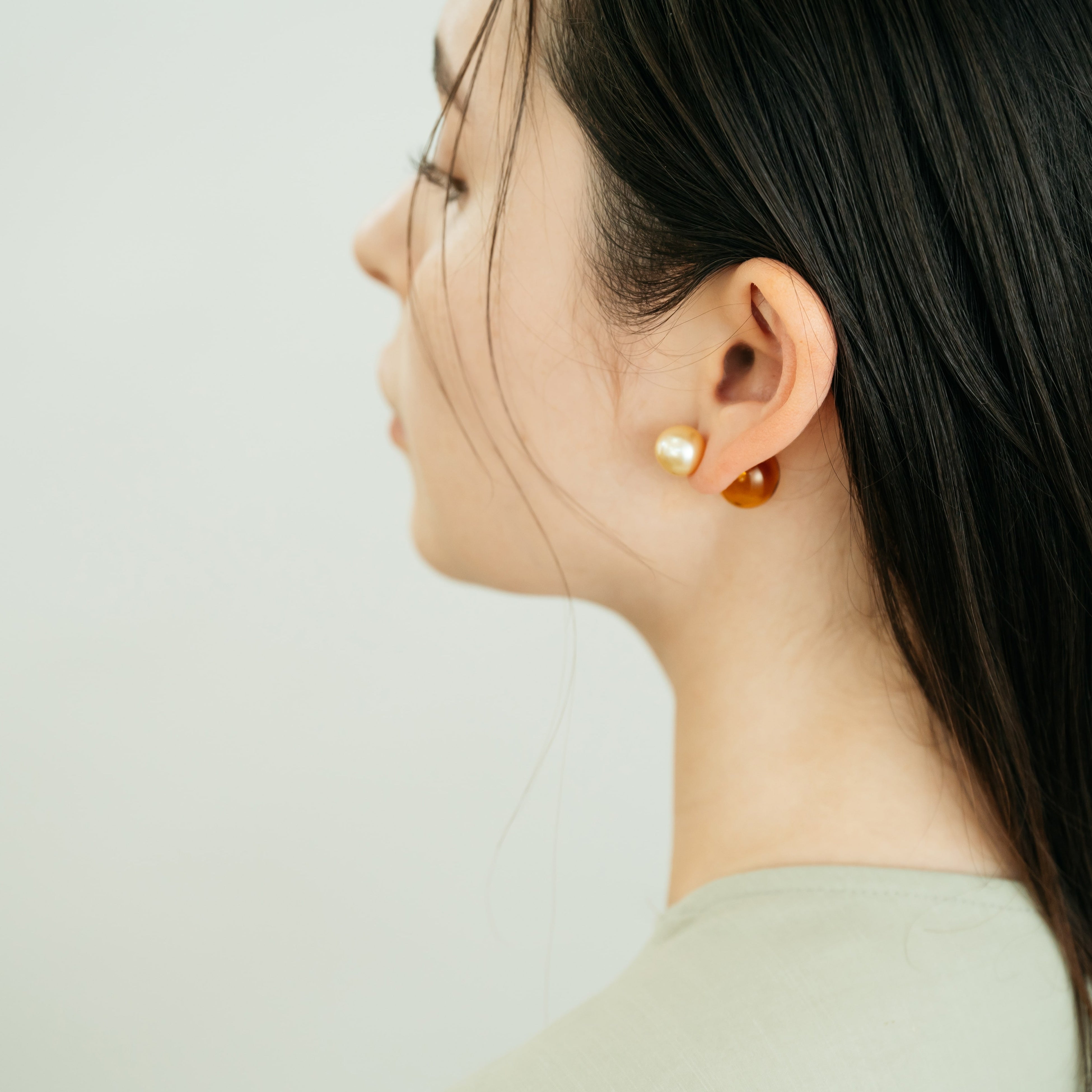 ガラスのバックキャッチと真珠を異素材で組み合わせた、アクセントの効いたアイテム。