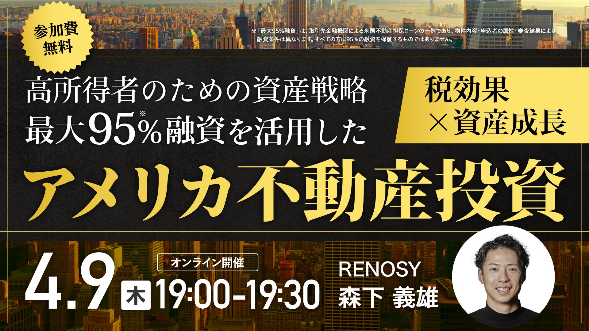 本セミナーでは、最大95%融資※の活用や、グループ会社による現地管理体制など、RENOSYが日本の投資家向けに整備した仕組みとともに、高所得者のための資産戦略を具体的に解説します。