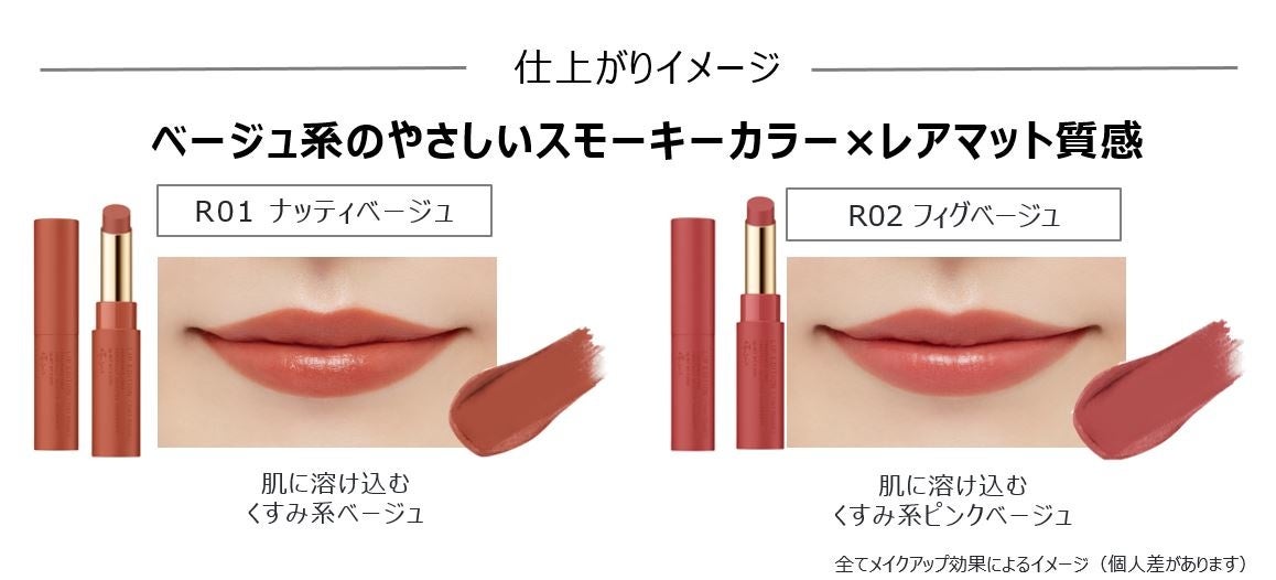 今っぽさをつくるベージュ系の肌なじみのよいやさしいスモーキーカラーの2色展開。厳選したベージュカラーは、肌の色になじみやすい処方です。