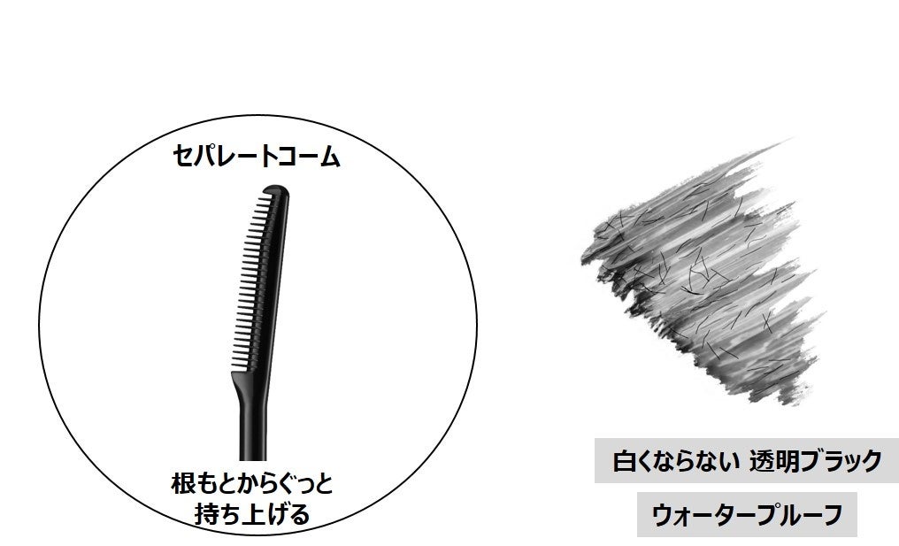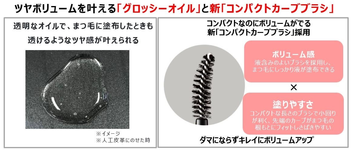 スモーキーカラー×ツヤボリュームのタッグにより、抜け感をキープしたまま、目もとを大きく印象的に見せる仕上がりに。グロッシーオイル配合で、透けるようなツヤ感を実現。さらに、コンパクトなのにボリューム感を与える新「コンパクトカールブラシ」を採用したことで、細いまつ毛までしっかり液を塗布しながら、キレイにさばけるので、ダマにならずにボリュームアップします。(*エテュセ内)