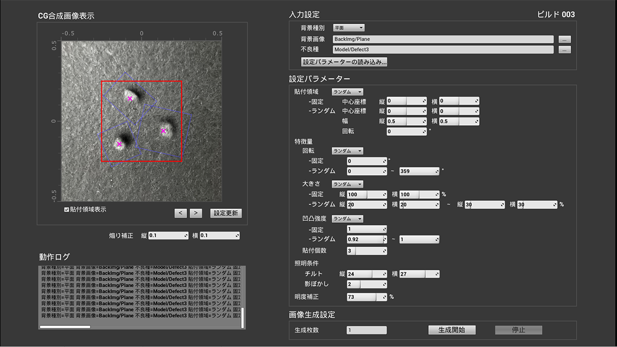 CG合成ツールは、背景画像と不良種画像を選択し、画面上で画像を確認しながら貼り付ける領域や大きさ、角度、照明条件などの各種パラメーターを、GUIにより自由に設定することができます。生成する画像枚数を指定して生成・保存、設定時のパラメーターも設定ファイルとして保存することが可能です。