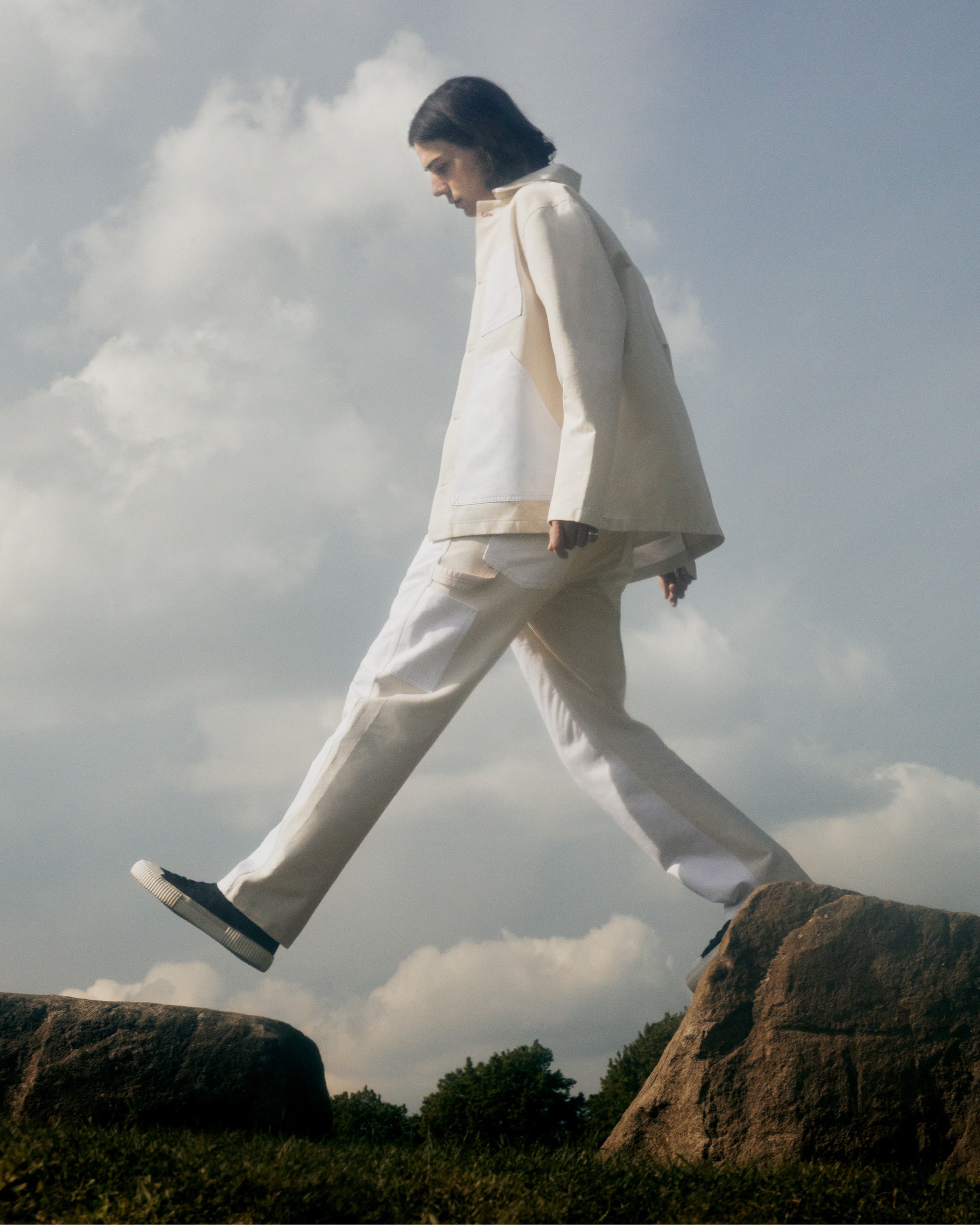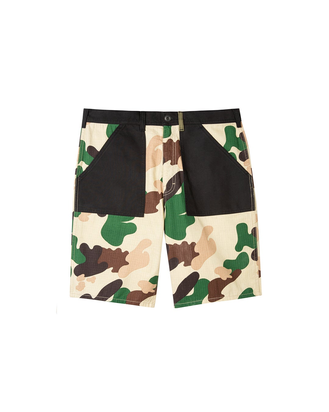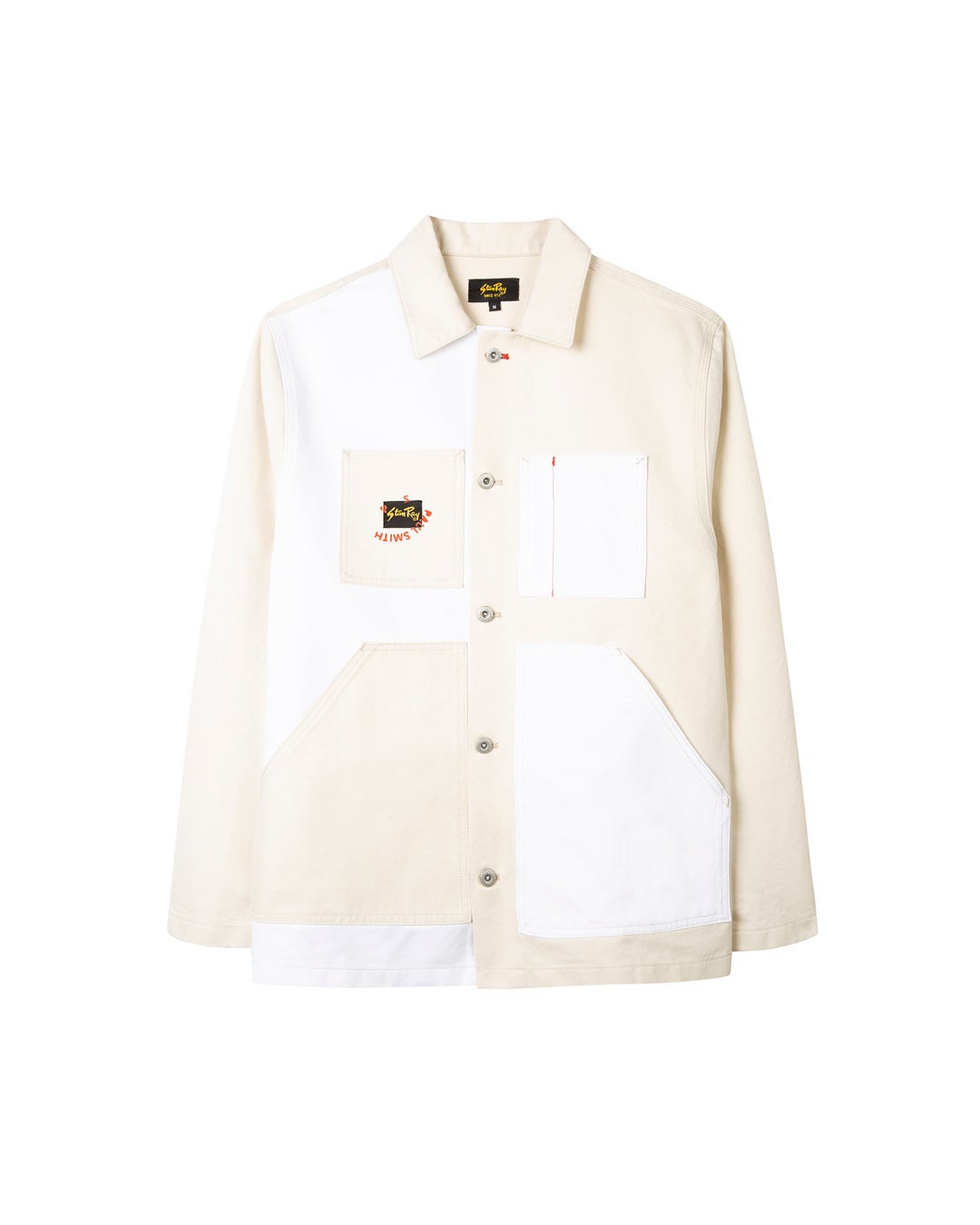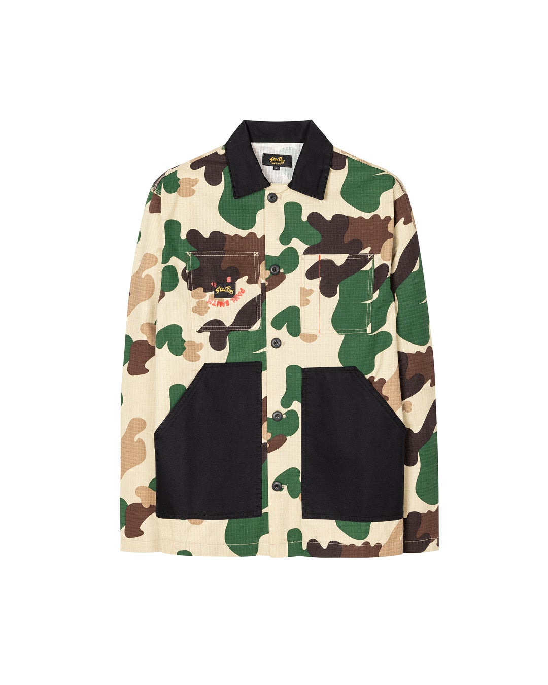 コレクションはパッチワークをテーマに、ペインターズパンツ、ショップジャケット、ファティーグショーツといったStan Rayを象徴するアイテムを、ツートーンカラーやカモフラージュ柄で展開します。素材は、コットンドリル、リップストップ、ミリタリーテイストのサテンといった丈夫な生地を採用し、耐久性のあるチェーンステッチで仕上げています。また、スナップボタン、パッチポケット、フラップポケット、ハンマーループなど、さまざまに実用的なディテールを備えています。