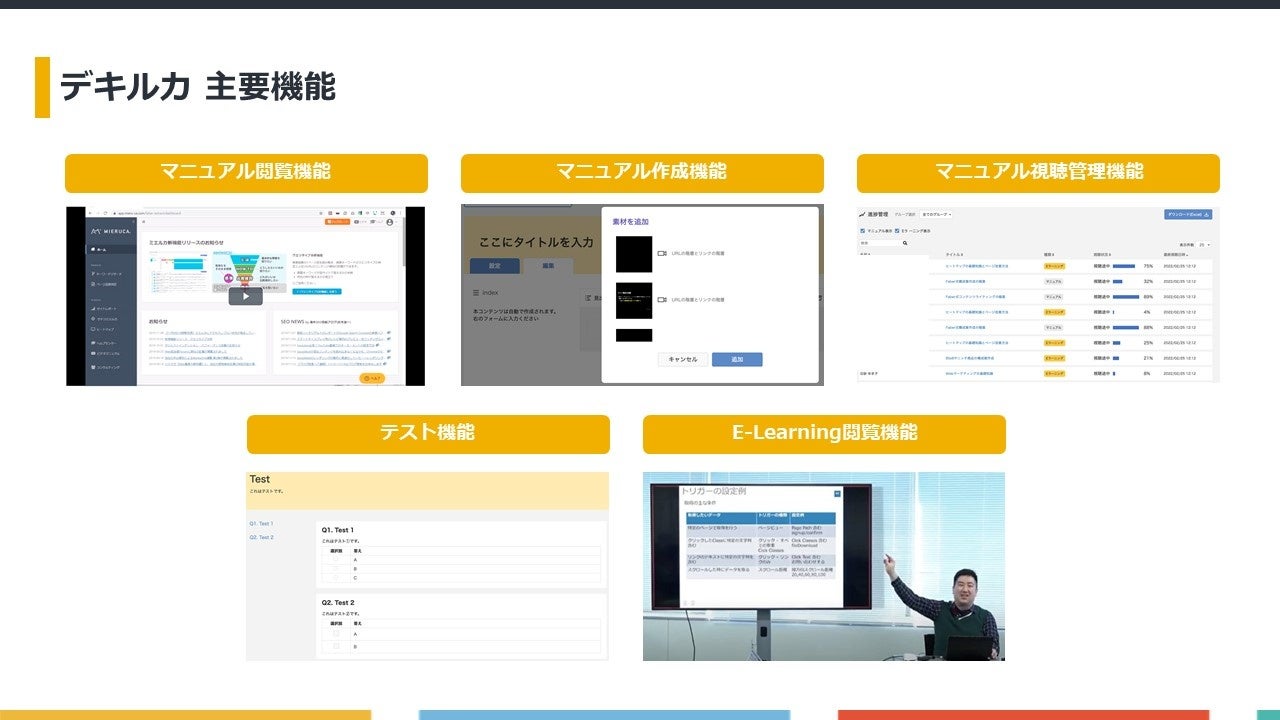 また、2周年に合わせて自社マニュアルやe-Learningの習熟度を測る「テスト機能」も追加いたしました。特徴は大きく以下の3点です。