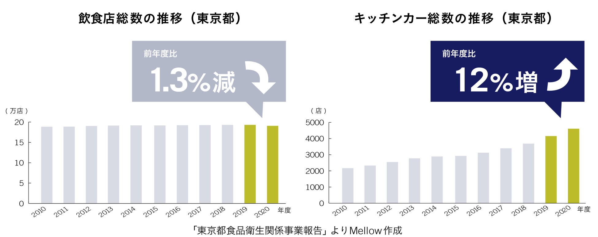 コロナ禍を経て飲食店業態の多角化が進みました。2020年には飲食店固定店舗数は減少に転じる一方、キッチンカーは機動力を活かせる業態として注目され、増加を続けています。(※データ1)