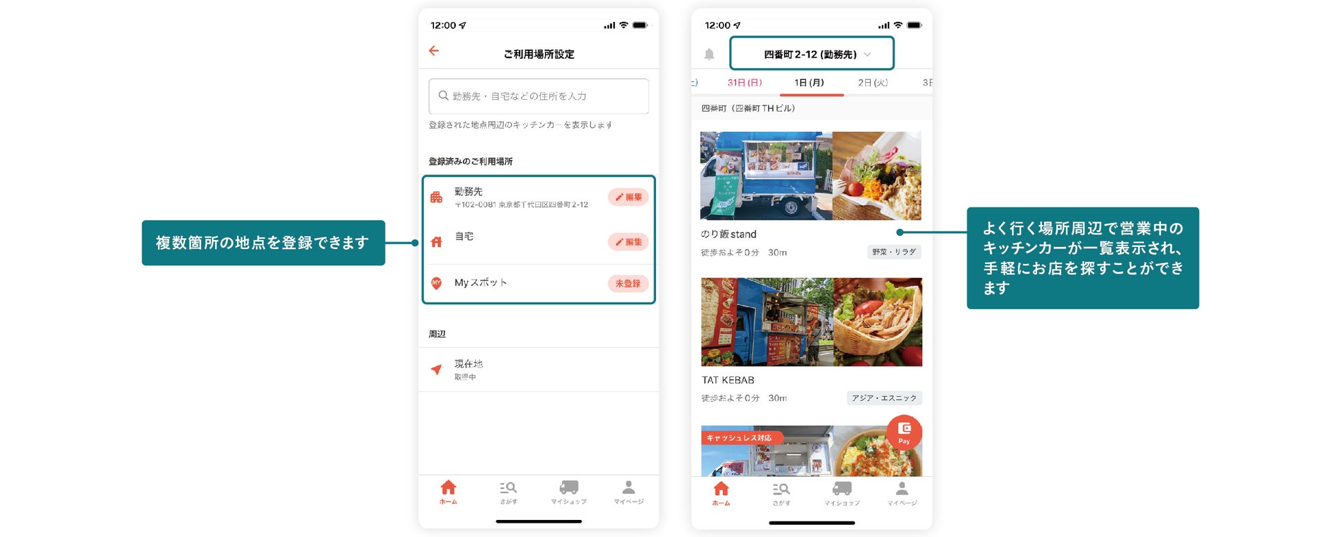 Myスポットとして勤務地、自宅等を登録することで、近くにいるキッチンカーが一覧表示されます。また、Myスポットに新たなキッチンカーが配車される場合通知されます。