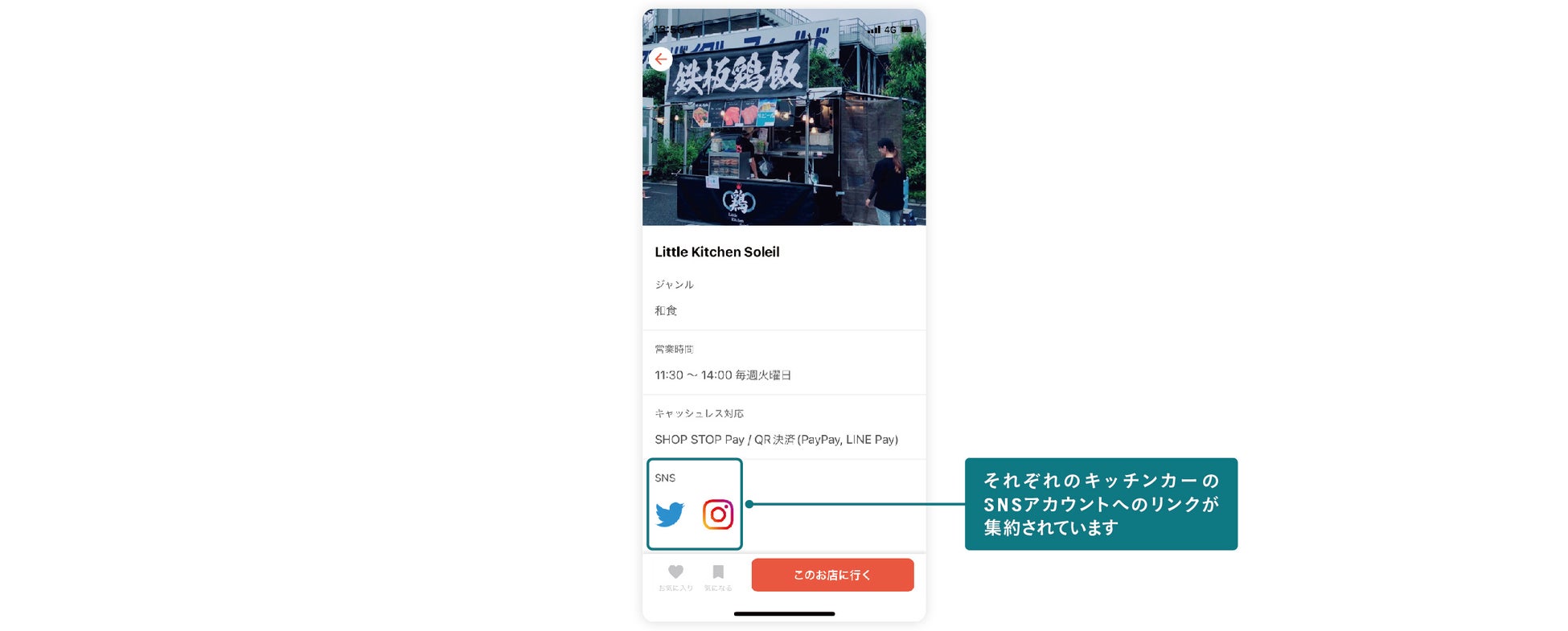 これまで顧客は個店ごとに点在する情報を探す必要がありましたが、アプリからお店のSNSに直接アクセスすることができます。お店のストーリーとの出会いがより豊かな食体験につながります。