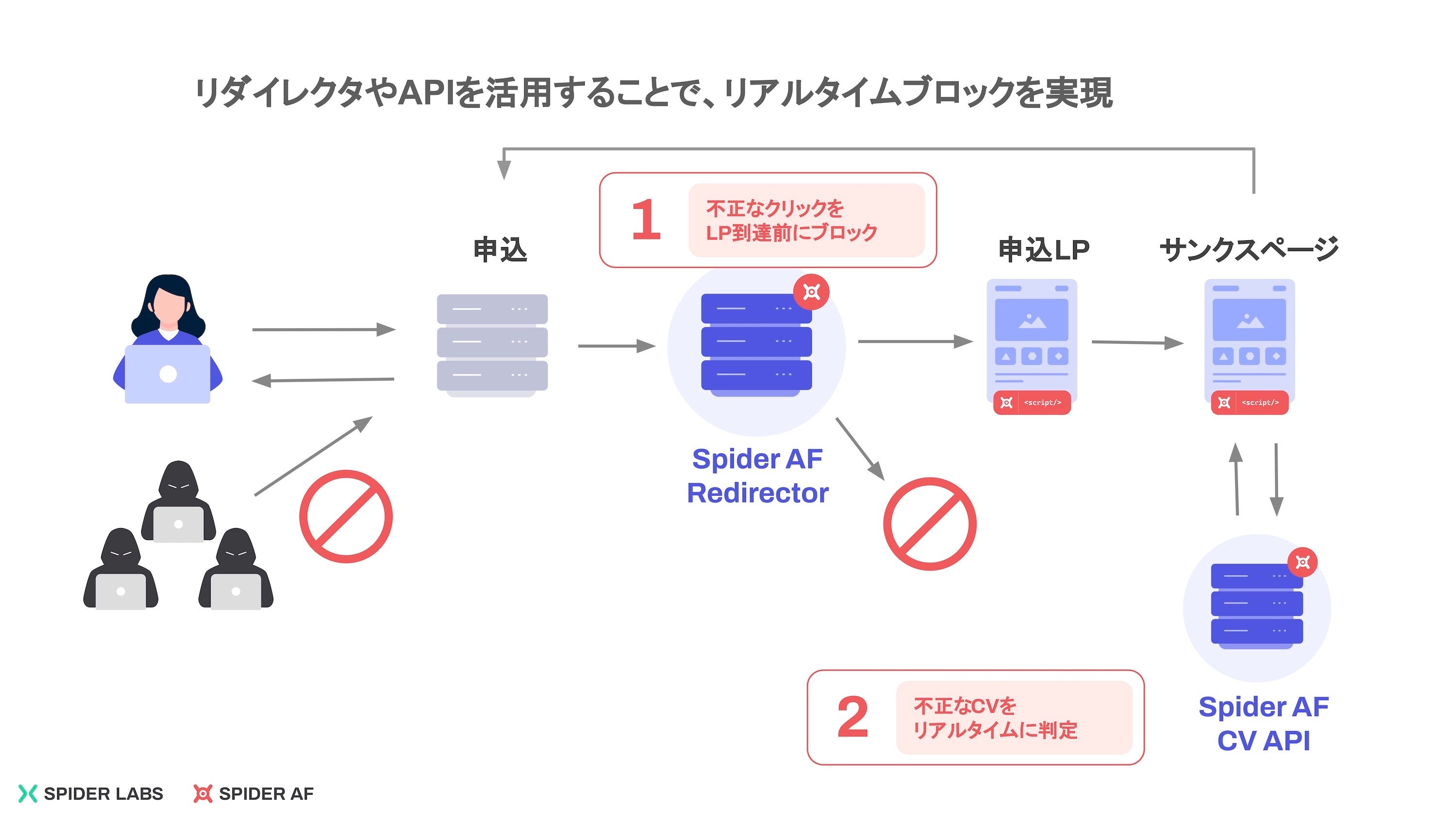 リダイレクタや不正判定API(双方のプログラミングをつなぐ「インターフェース」)を活用することで、不正なユーザーや申し込みなどからリアルタイムに検知、ブロックが可能となります。その精度は当社が長年培ってきたデータ解析技術により、不正な成果を高い精度で検知します。