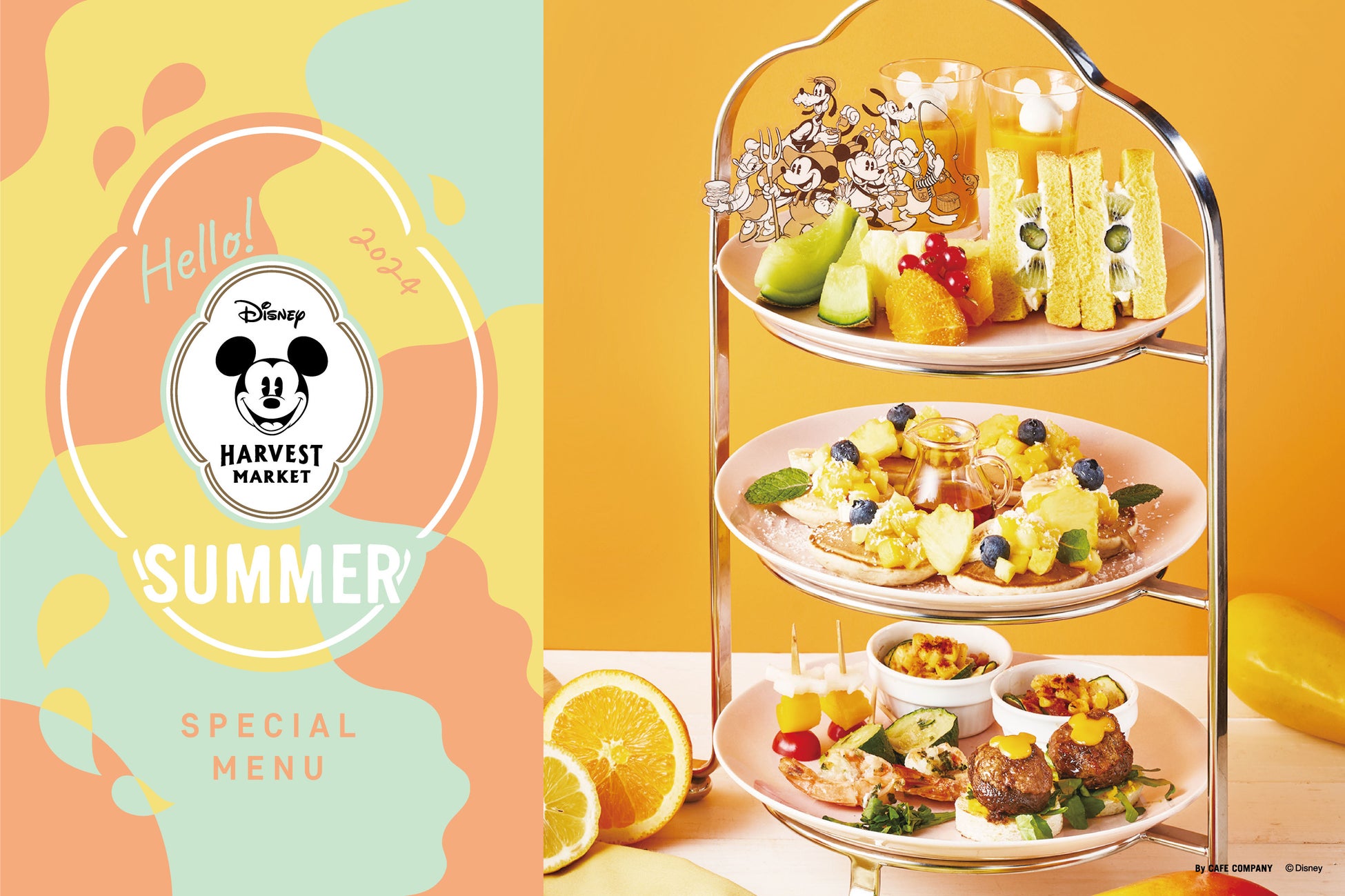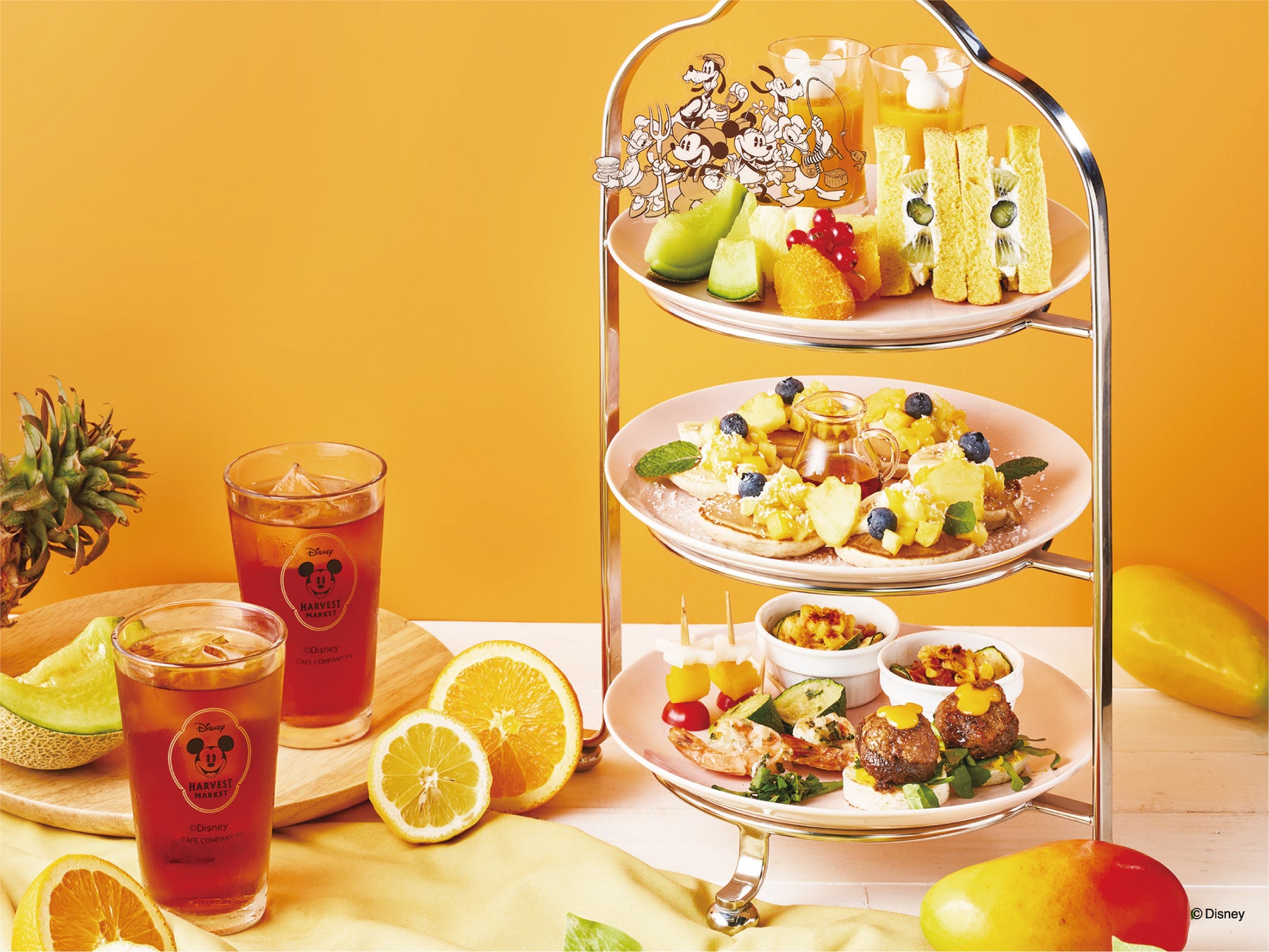 カフェ・カンパニー株式会社(所在地:東京都渋谷区、代表取締役社長:楠本修二郎、以下、カフェ・カンパニー)が、ウォルト・ディズニー・ジャパン株式会社(以下、ディズニー)とのライセンス契約に基づき運営するカフェ&ギフトショップ「Disney HARVEST MARKET(ディズニー・ハーベスト・マーケット) By CAFE COMPANY」では、5月28日(火)より、 「はじける夏の果実! 季節限定アフターヌーンティーセット」等、全3品の期間限定メニューの販売をスタートいたします。