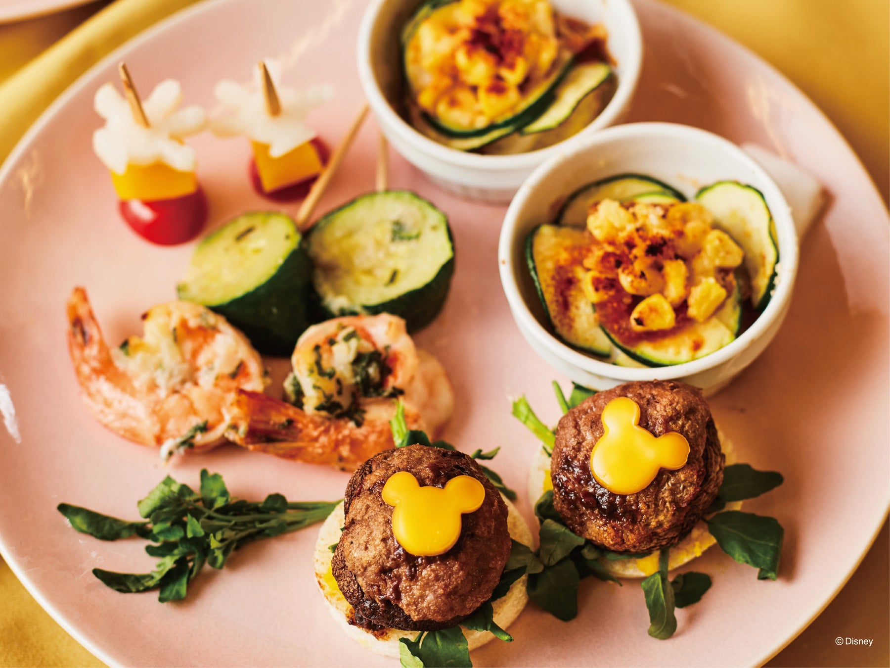 内容は、真っ白なスタチュー風のレアチーズをトッピングしたマンゴー&オレンジのゼリー、ドナルドダックの足型パインをあしらったトロピカルフルーツ&ココナッツのオートミール入りパンケーキ、キウイ&ブルーベリーと特製クリームをほのかな甘味のかぼちゃパンで挟んだサマーフルーツサンド、ミッキーマウス型のチーズを乗せたロコモコ風しいたけバーグのオープンサンド、青紫蘇が爽やかなガーリックシュリンプやミッキーマウスの手型ピクルス、とうもろこしとズッキーニのスパイシーミニグラタンなど、様々なメニューを一度に楽しめるティーセットです。