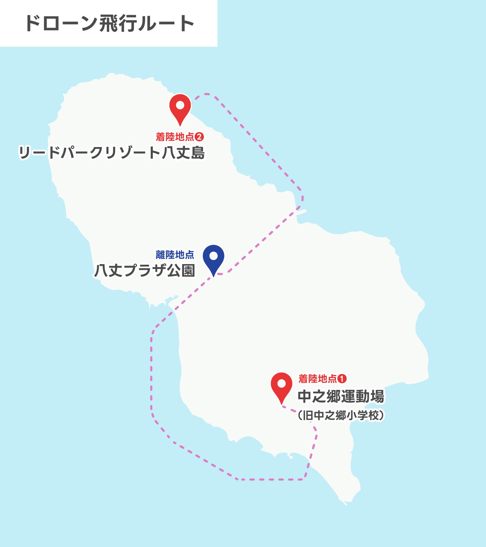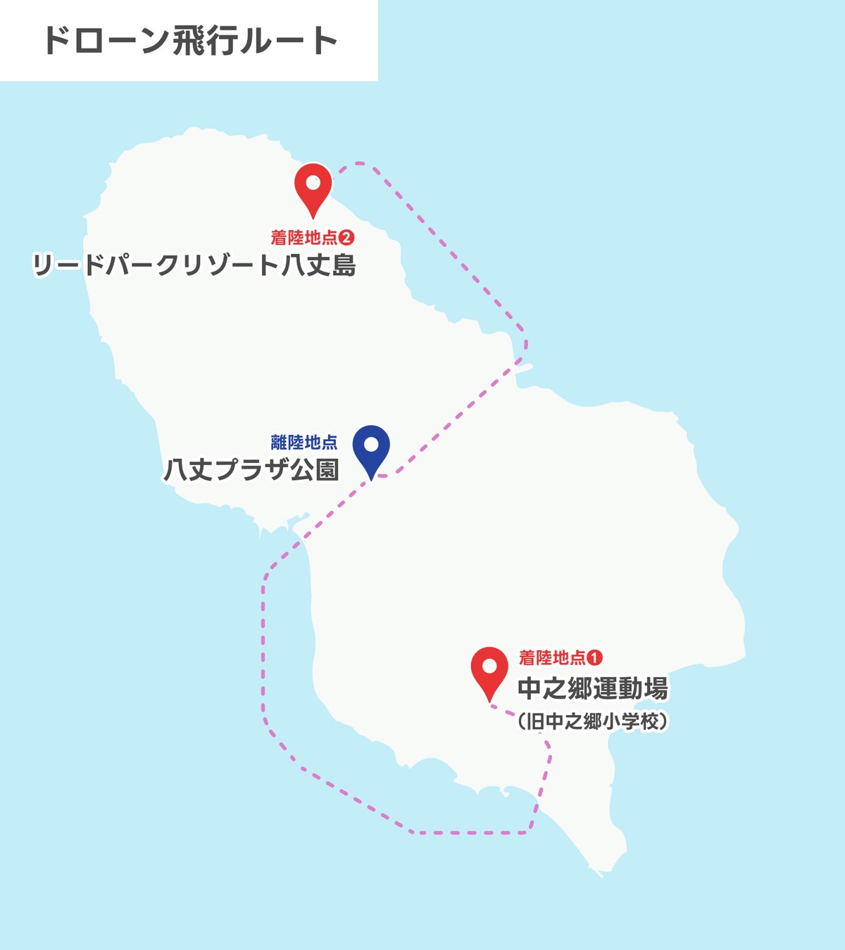 交通が不便な地域に住む島民への買物支援や観光施設との連携を想定し、ドローンによる配送先を2か所(①中之郷運動場、②リードパークリゾート八丈島)設置し、店舗が多く集まる地域にほど近い八丈プラザ公園からドローンで配送しました。