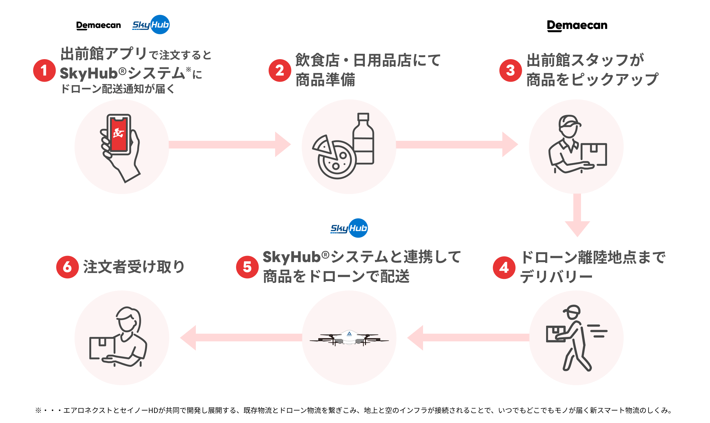 セイノーホールディングス株式会社とエアロネクストが開発推進するドローン配送と陸上輸送を融合した新スマート物流*1”SkyHub®*2 “でプラットフォームとして使用するSkyHub®システムと出前館アプリを連携させ、注文者が『出前館』アプリで注文すると、配送スタッフが商品を受け取り、ドローン離陸場所である八丈プラザ公園まで陸送によりデリバリーし、ドローンにセットします。中之郷運動場までは片道約約9.6kmを約22分、リードパークリゾート八丈島までは片道約7.9kmを約19分で物流専用ドローンAirTruck*3で飛行し、注文者に届けられました。中之郷運動場で商品を受け取った注文者からは、「八丈プラザ公園からドローンで飛んでくるということだったので、届く頃には冷めているのかなと思いましたが、温かく美味しかったです。」という声が聞かれました。