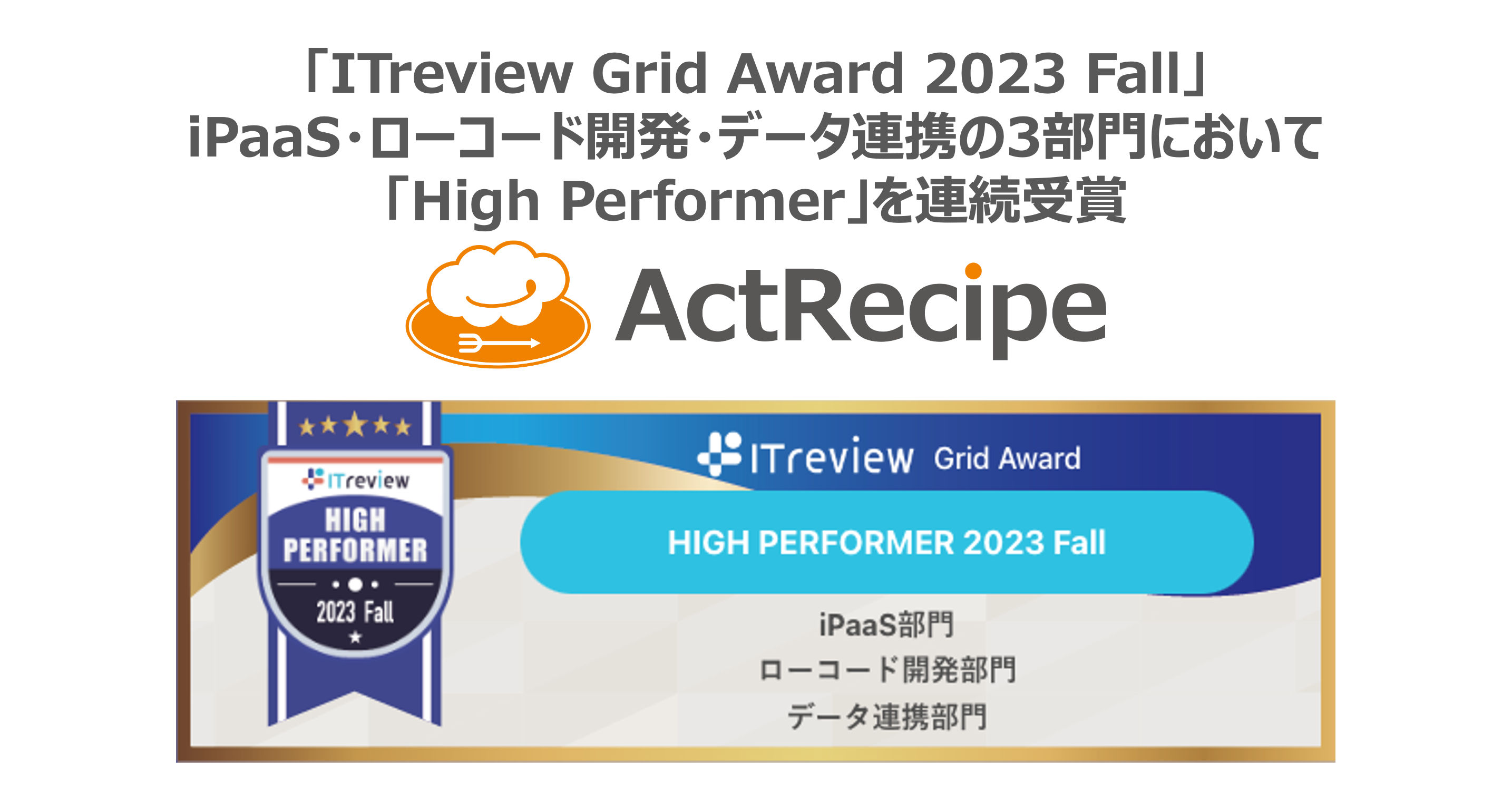 iPaaS「ActRecipe」が「ITreview Grid Award 2023 Fall」において3部門で「High Performer」を連続受賞