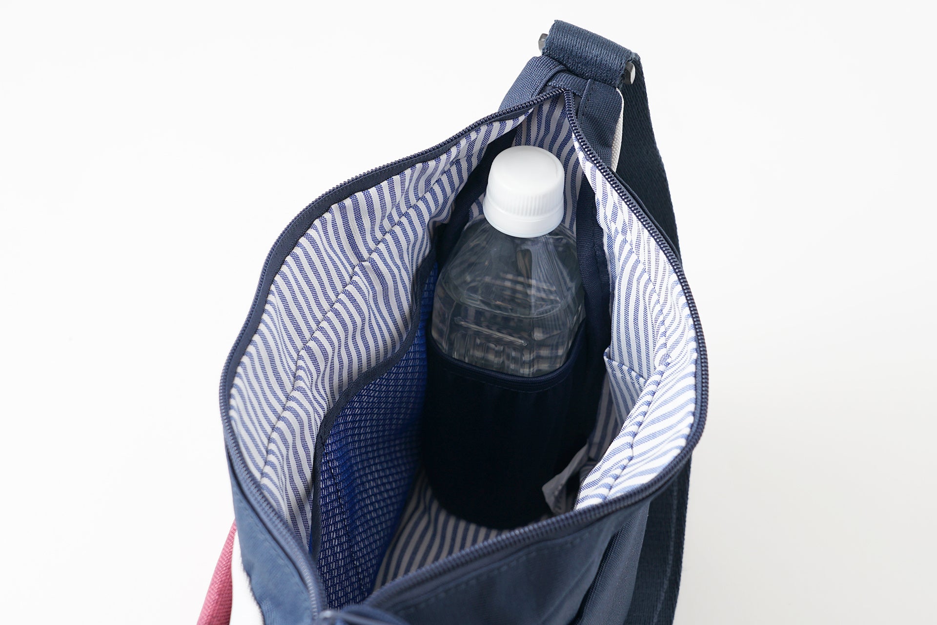また、見た目の可愛さだけでなく、小物を美しく整理できる「10個のポケット」や、500mlペットボトルを立てて収納できる独自の「moz pocket」など、使う人の日常に寄り添った設計が魅力です。内装には視認性の良いホワイト×ブルーのストライプ柄を採用し、荷物を探す手間を省くだけでなく、開けるたびに楽しい気分に。