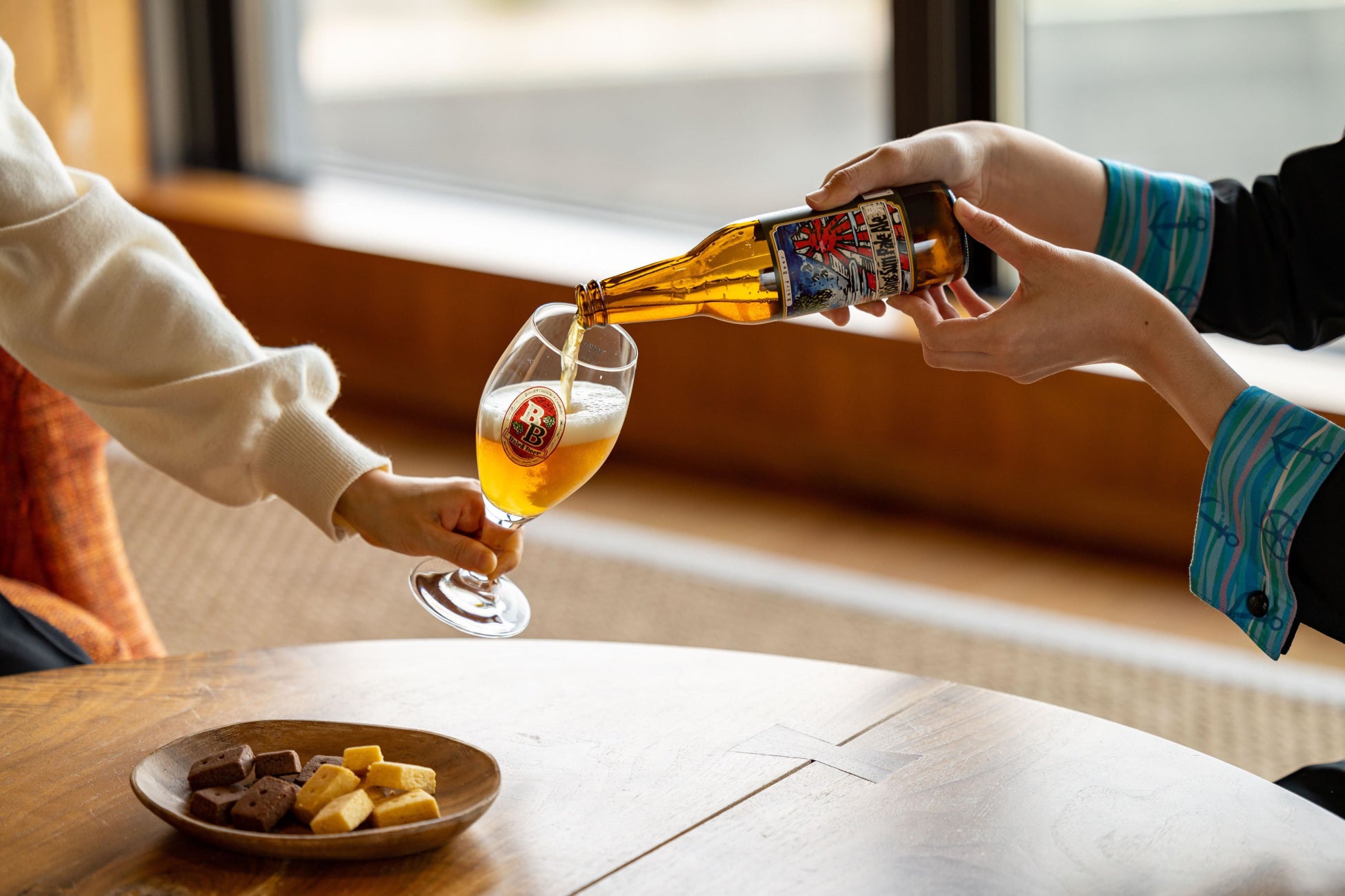 宿到着後は、3種類のベアードビールを滞在シーンに沿って用意します。まずは、ウェルカムドリンクの「ライジングサンペールエール」。日本の象徴・富士山から昇る太陽のラベルが印象的なボトルです。全室オーシャンビューのお部屋でいただきながら、翌朝の伊東の海の朝焼けに期待が膨らむ一杯です。