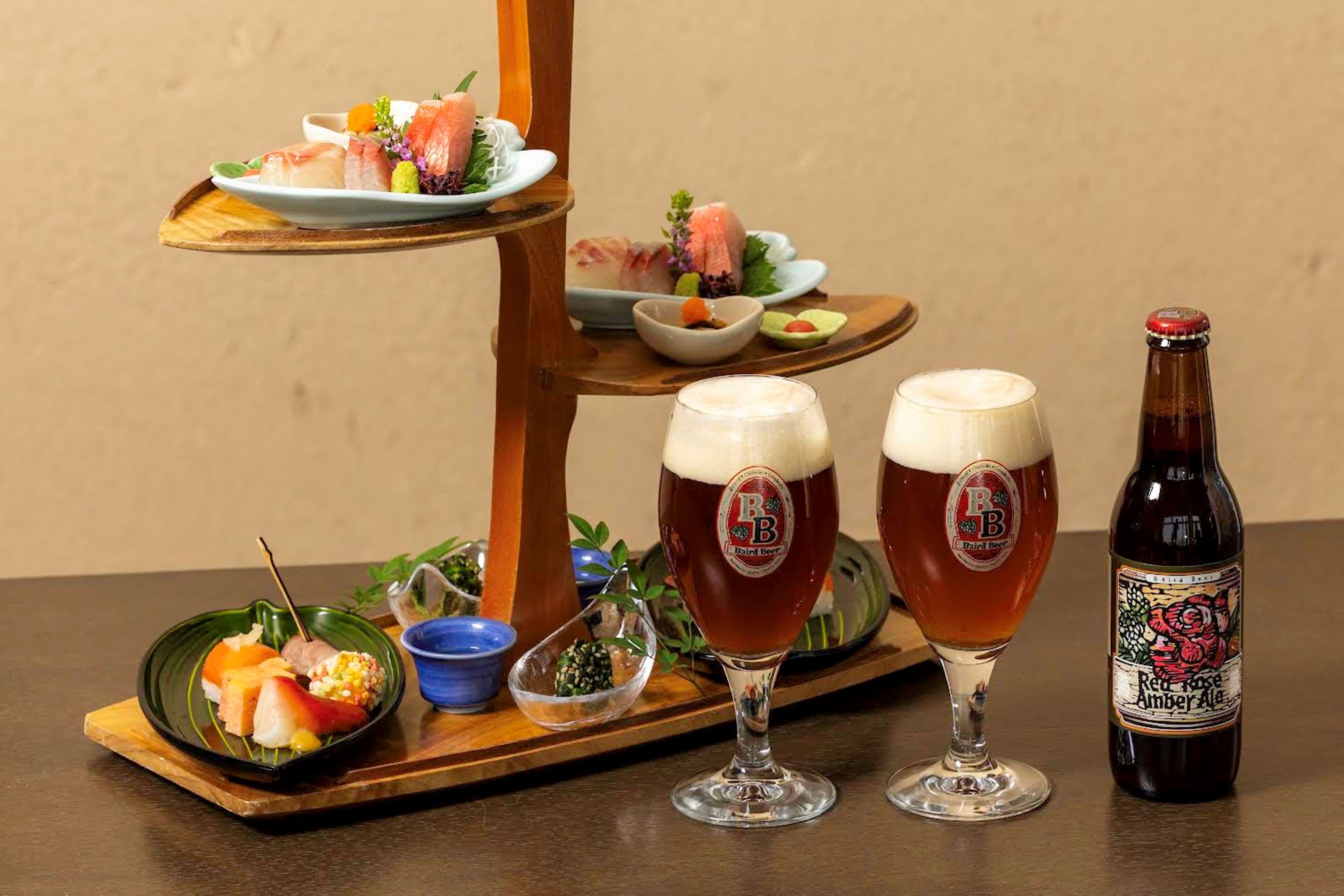 夕食の会席料理には、「レッドローズアンバーエール」をペアリング。当館の由来である三浦按針の故郷イギリスの国花、ローズのラベルが印象的なボトルです。フルーティな味わいと幾重に香るフレーバーと頂く、本体験ならではの特別なペアリングです。