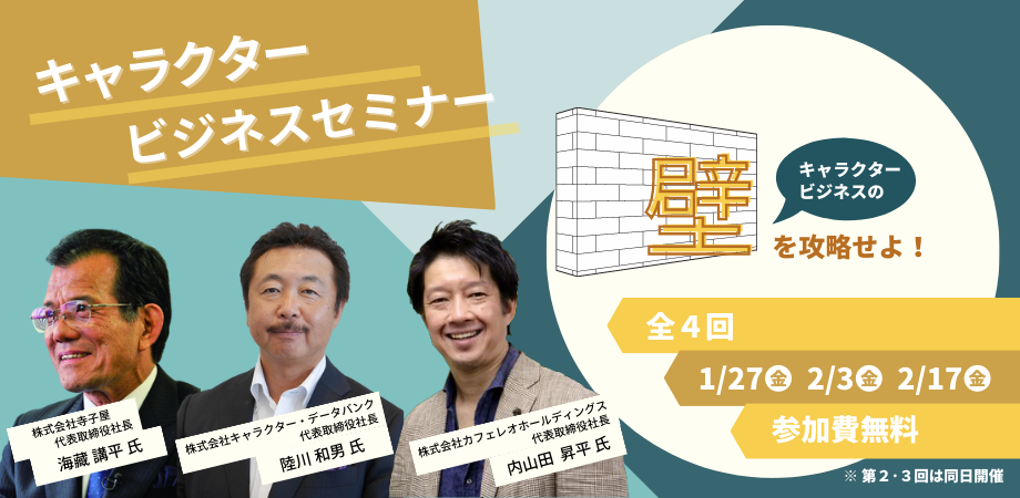 キャラクタービジネスを基礎から学ぶ『キャラクタービジネスセミナー「壁シリーズ」』全4回。1月13日(金)より申込受付を開始。