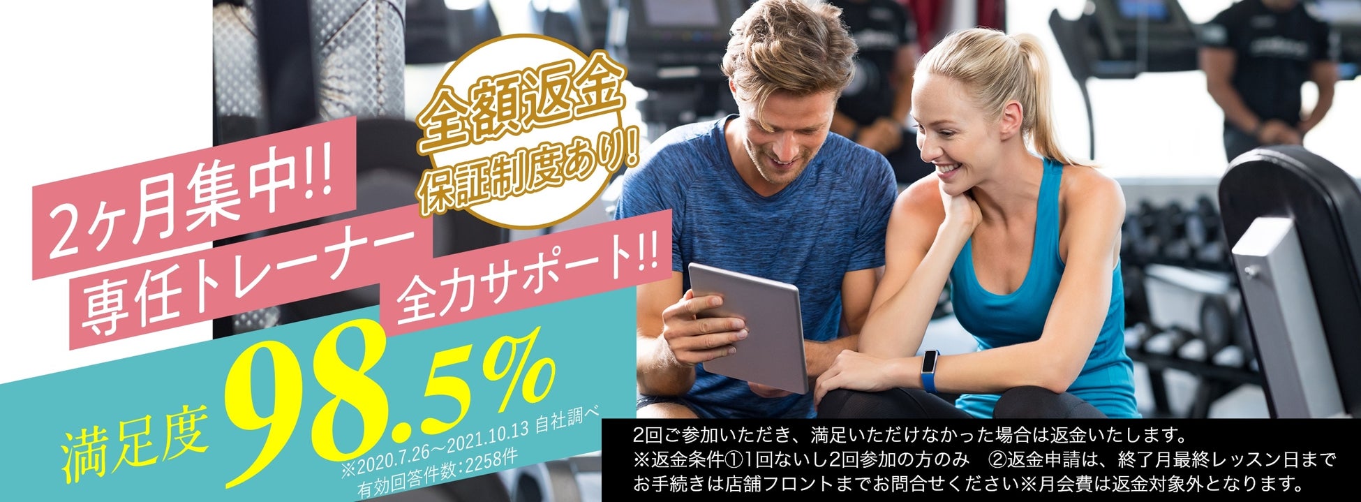 フィットネスジャーニーに2回ご参加いただき、ご満足いただけなかった場合は返金いたします。