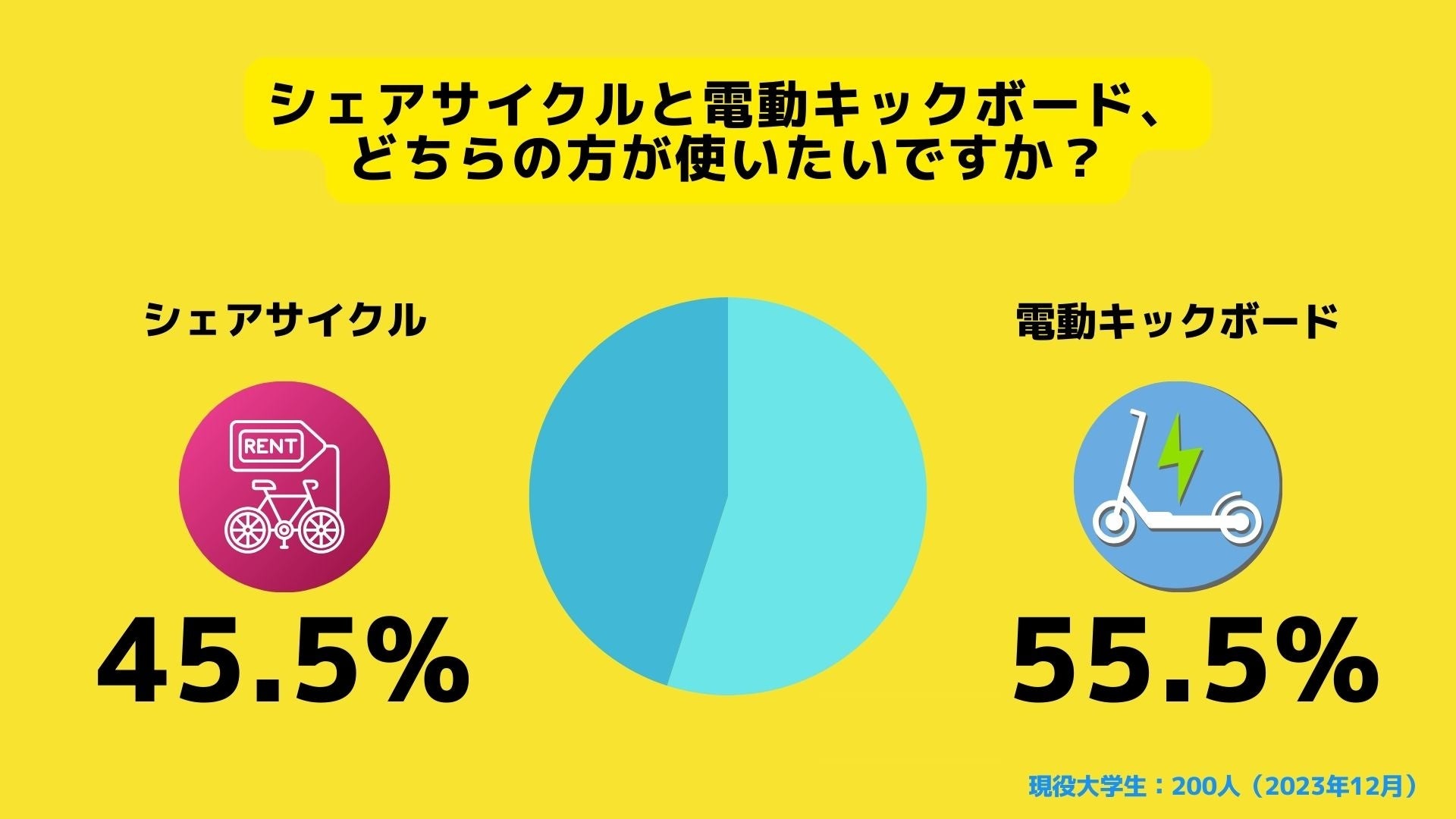 「シェアサイクルと電動キックボード、どちらを使いたいですか?」という設問では、電動キックボードを使いたい大学生が55.5%と僅差で勝利。