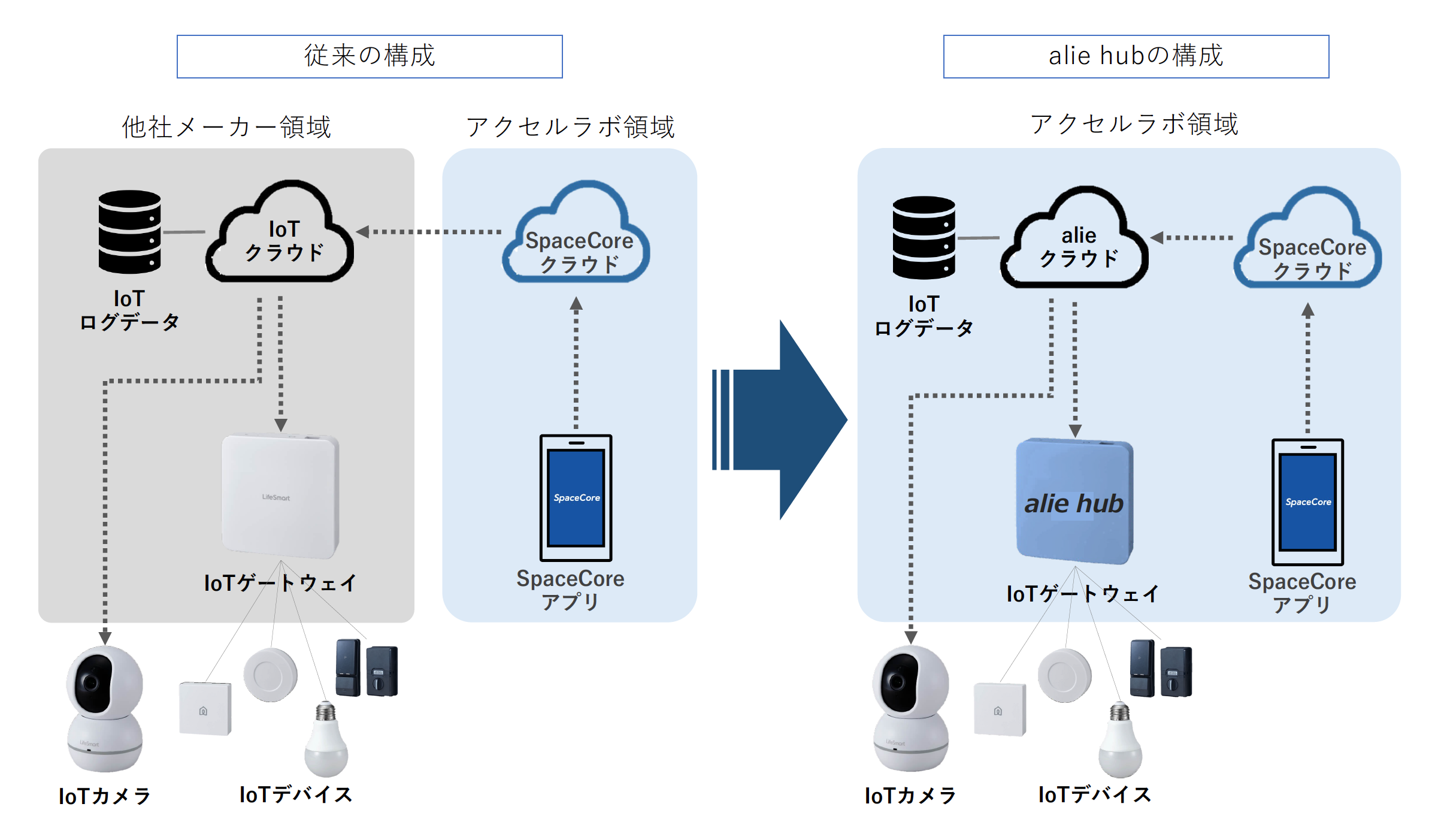 これまでのシステム構成ではデバイス提供元メーカーが管理するクラウドを介したIoTデバイスの制御や、ログデータの管理を行なっておりました。「alie hub」ではIoTデバイスの制御やログデータの管理など、全ての処理を自社のIoTクラウドで行います。