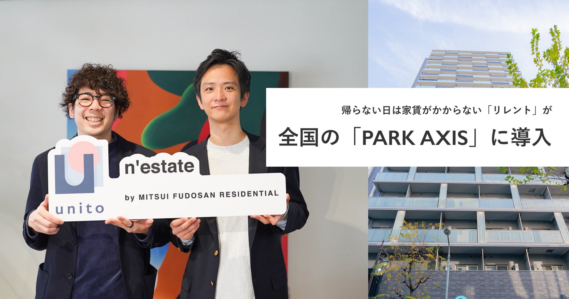 帰らない日は家賃がかからない住まい「unito(ユニット)」を提供する株式会社Unito(東京都千代田区、代表取締役:近藤佑太朗、以下ユニット)は、ユニットの独自システムである「帰らない日は家賃がかからないリレント」の仕組みを、三井不動産レジデンシャル株式会社(本社:東京都中央区、代表取締役社長:嘉村徹)が展開する多拠点居住サービス「n’estate(ネステート)」の拠点拡大に伴い、累計で全国の賃貸マンションシリーズ「PARK AXIS(パークアクシス)」全5棟で導入されたことをお知らせいたします。