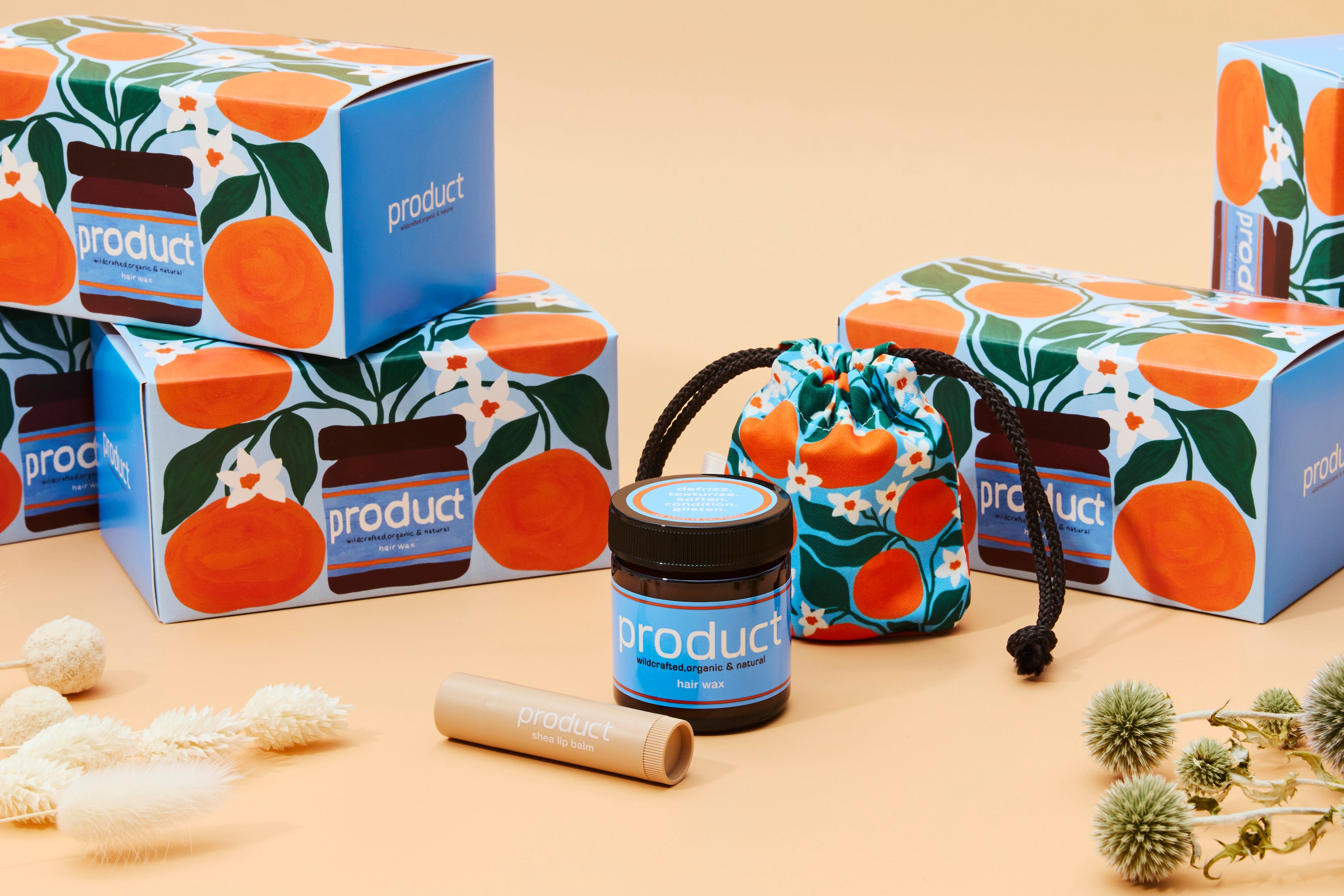 トボックスは、「Liv Lee」さん特有の歪で自然な形のデザインと鮮やかな色で、2つの商品に共通する香りであるオレンジと『product』の象徴であるヘアワックスをモチーフに描かれています。