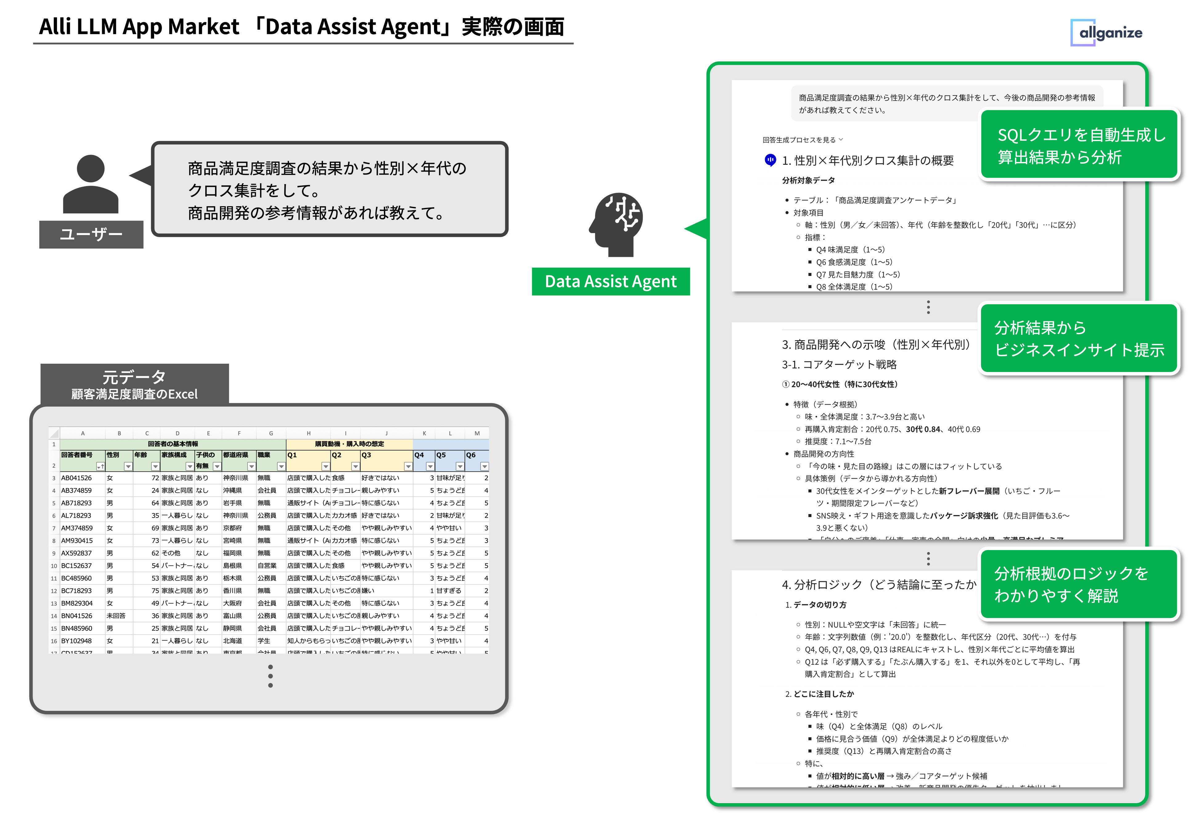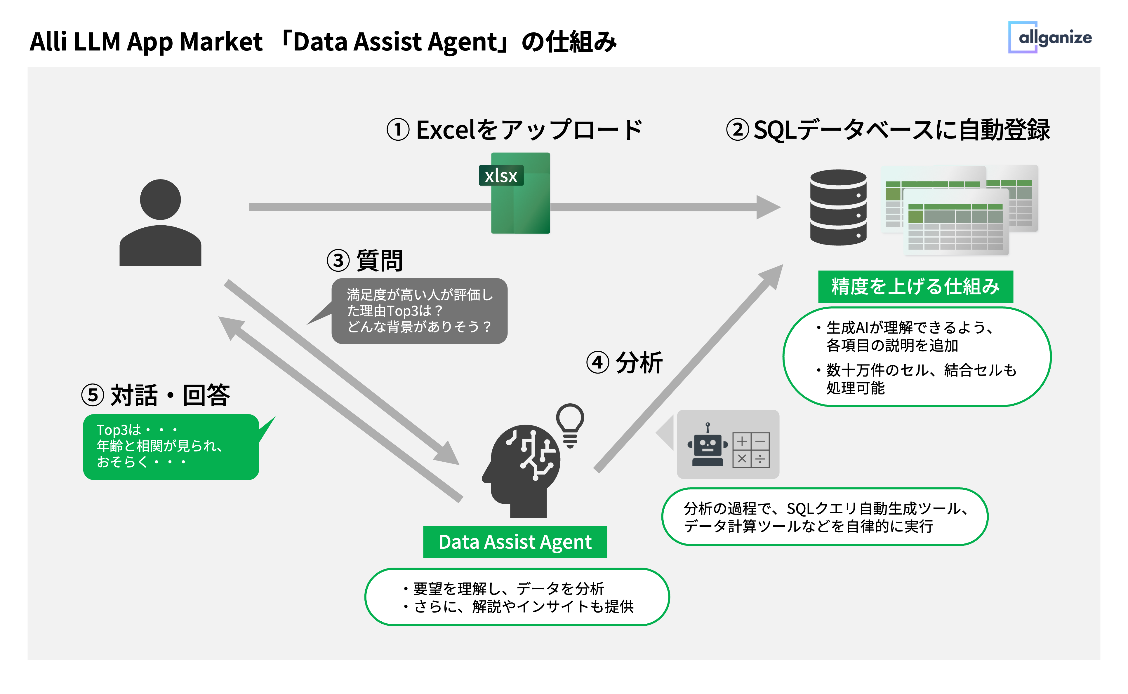 AIで企業の生産性を革新するオールインワンの生成AI・LLMソリューションを提供するAllganize Japan株式会社(代表取締役CEO:佐藤 康雄、以下:「Allganize」)は、Excel形式のファイルに保存されている大量データをもとに、対話しながら自律的にデータ分析を行う「Data Assist Agent」の提供を開始しました。Allganizeの提供するオールインワン生成AI・AIエージェントプラットフォーム「Alli LLM App Market」の100以上の標準生成AIアプリ・AIエージェントの一つとして、「Data Assist Agent」を提供いたします。