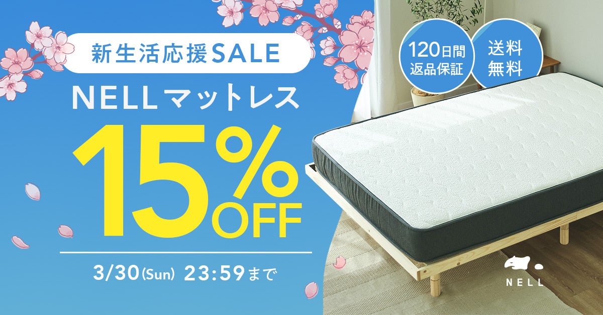 本セールは、3月30日(日)までの期間限定で実施され、マットレスやボックスシーツが全サイズ15%OFFとなります。さらに、1月23日(木)に発売された「NELL まくら・NELL まくらカバー」も今回から割引対象に含まれます。