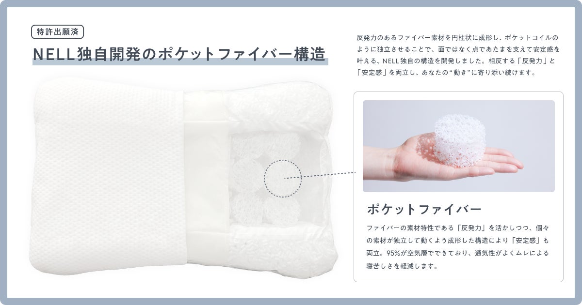 新世代のまくらである「NELL まくら」は、単一素材ではなく、適材適所に質の高い素材を組み合わせ、中心部に伸縮性の高い「ポケットファイバー」を敷き詰めることで、多様な寝姿勢でも安定して支え、スムーズな寝返りも可能にします。
