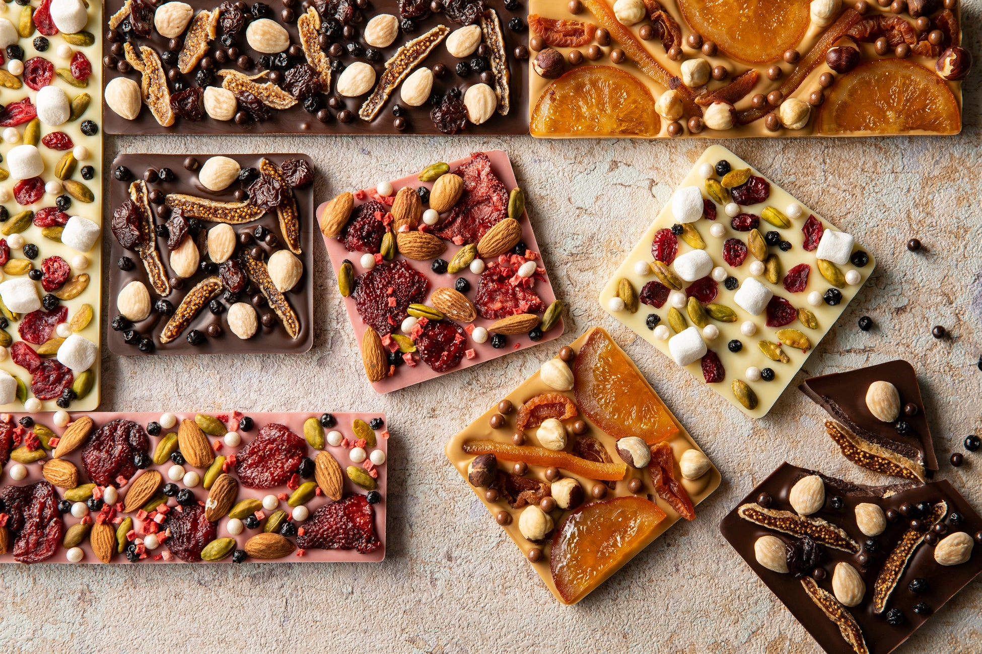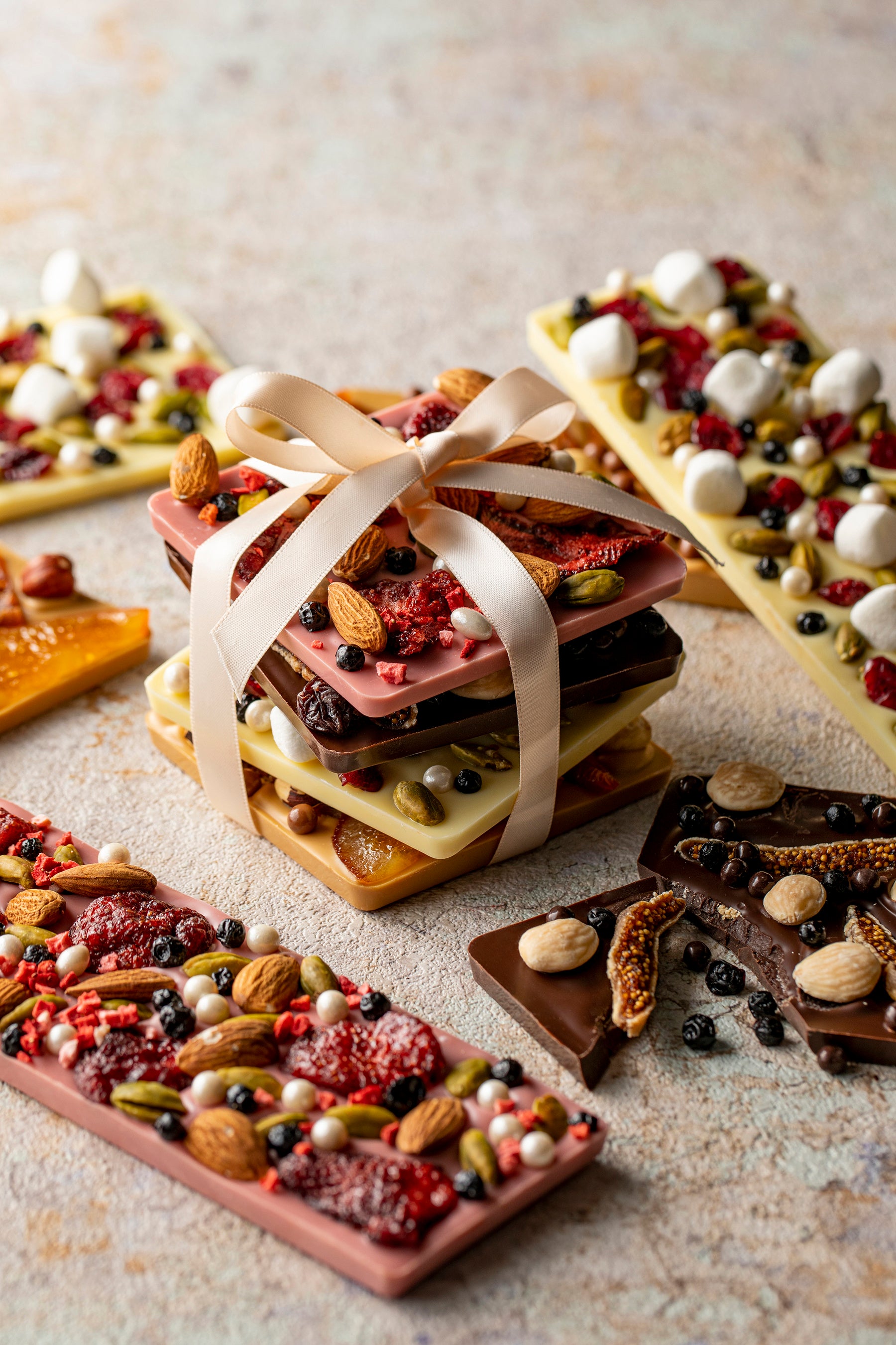 カカオバリーのブランサタン29%を使用。ほのかな酸味と濃厚な甘さが凝縮されたドライクランベリーとドライワイルドベリー、ピスタチオに加え、マシュマロとホワイトパールクラッカンをトッピングした華やかな色合いのマンディアンです。一口毎に様々な風味と食感が楽しめます。